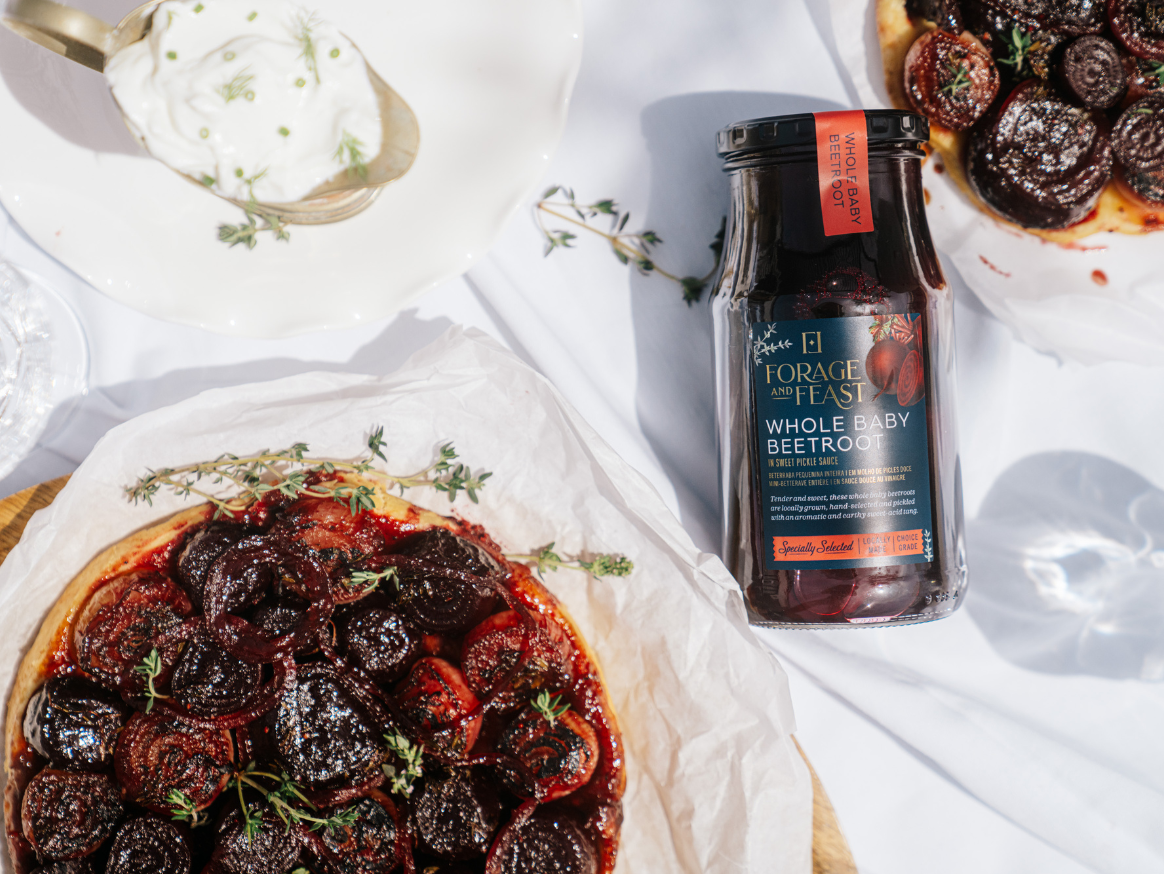 Bring a touch of festive charm to your table with this Beetroot and Pearl Onion Tarte Tatin, adorned with the vibrant red hues of baby beetroot — like glistening little gems. Beetroot preserve holds a cherished spot in South African kitchens, and having a jar or two of this Forage and Feast Whole Baby Beetroot in the pantry can be a lifesaver for whipping up quick and delicious salads or dishes. Paired with caramelised pearl onions and topped with whipped goat’s cheese, this elegant recipe is sure to impress and celebrate the season’s warm, inviting spirit.