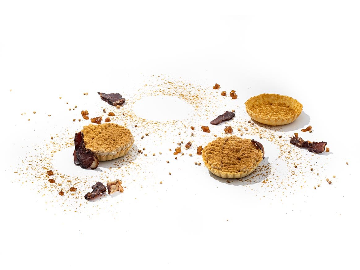 Scoop the mousse into a piping bag, fitted with a petal shaped nozzle. Place the tart shells on your surface and fill with pear compote and even out. The pear compote must cover the base of the tart shell. Even it out to ensure the mousse will be piped on evenly. Pipe the biltong and pear mousse on top of the compote in three even sections, and dust with biltong powder.