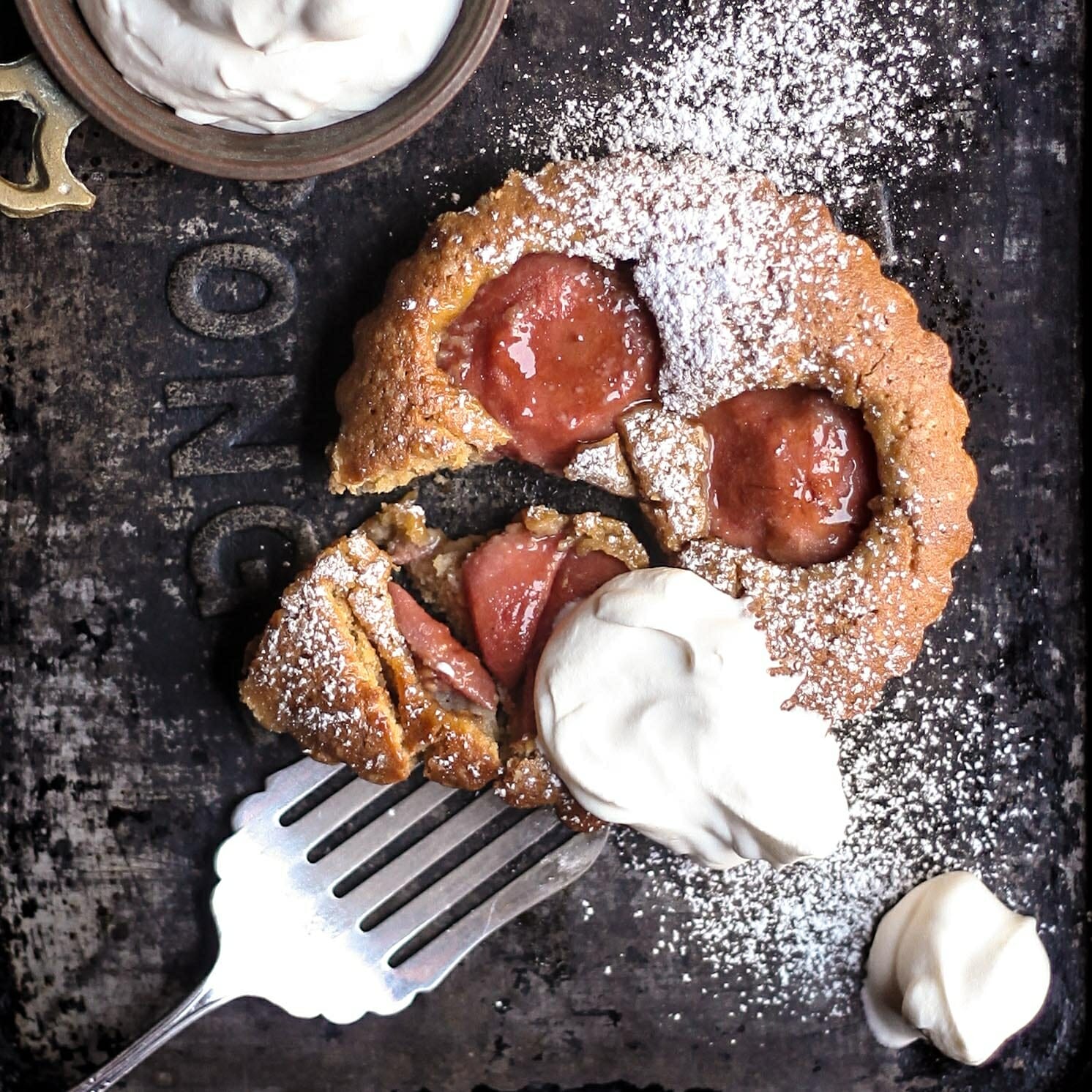 In South Africa, September to February is guava season! And although there’s nothing stopping you from using freshly peeled and halved guavas in this recipe, using preserved guavas means you can make this delicious dessert all year round. The ground almonds lend these tarts a great crumbly texture, so make sure you don’t buy almond meal – the base ingredient in macarons – which has a finer, more delicate consistency. Suffusing the cream with brandy garnishes these tarts, which are not overly sweet, with a delectable dollop of festive flair.