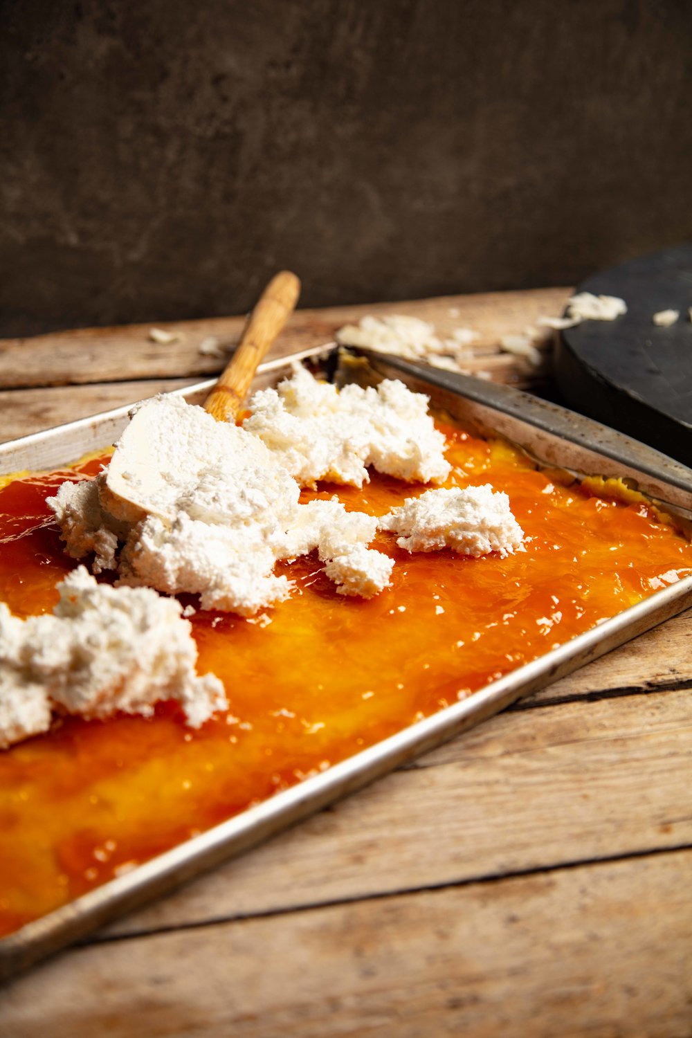 We all deserve a shortcut: no rolling out the pastry, no letting it rest in the fridge overnight, just press it out onto the baking tray, smother it in apricot jam, whip up some coconut meringue and pop it in the oven. But what I love most about these Hertzoggies is that you lose count after eating the third one.