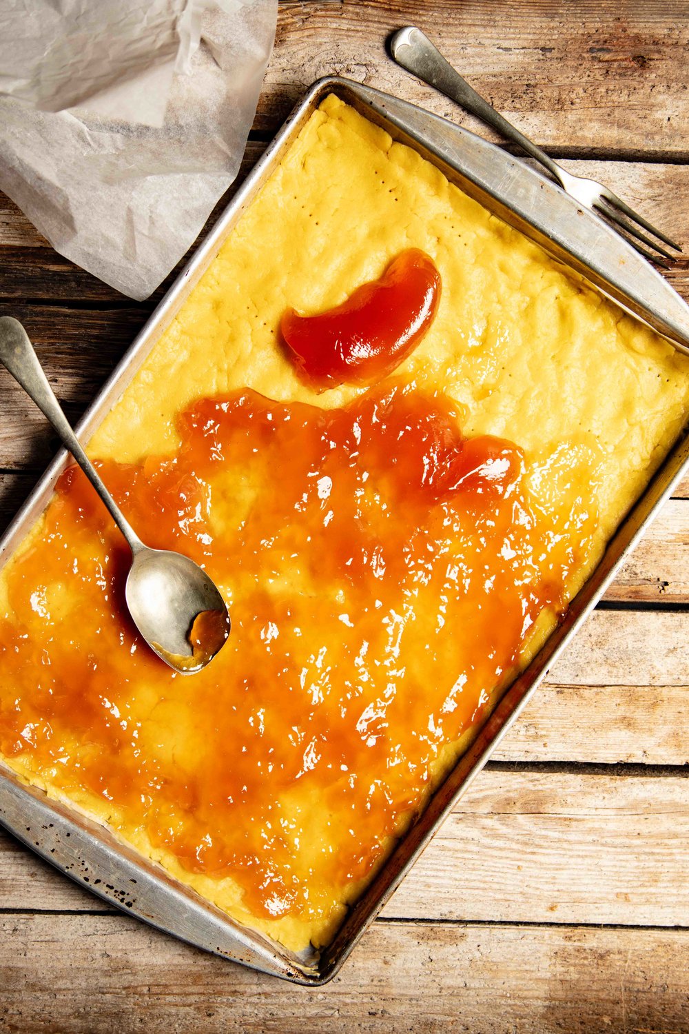 Line a 35 x 25 x 2 cm baking tray with baking paper. Press the dough out evenly onto the tray and spread the jam liberally over the dough.