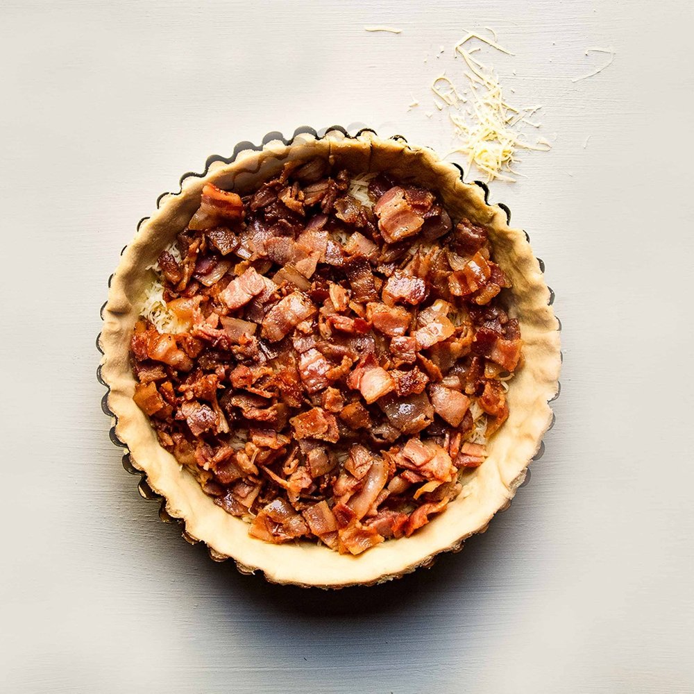 Sprinkle the grated Gruyère cheese in the blind baked quiche tin. Sprinkle the bacon on top of the cheese.