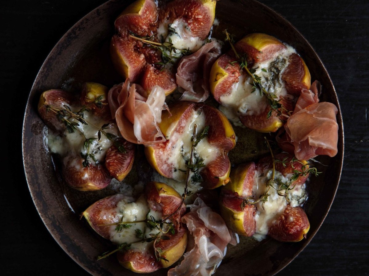 Preheat the oven to 180 °C. Using a sharp knife, cut a cross into the top of 6 ripe figs. Then, gently squeeze the bottom of each fig until it opens. Divide 75 g of soft blue cheese, such as gorgonzola, and stuff the figs with the cheese. Place the prepared figs on a baking tray and put a fresh sprig of thyme on top of each fig. Drizzle a little olive oil over the figs and place them in the oven. Bake for 8 – 10 minutes, or until the cheese has melted. Place 6 slices of Parma ham between the figs and serve.