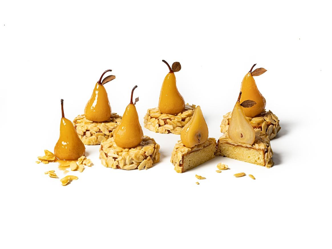 Place the butter, sugar and milk in a saucepan. Place on a medium heat and keep stirring until the sugar has dissolved. Bring to a simmer and let it cook until golden – about 15 minutes. Add the almonds and mix well. Let it cool slightly before applying to the cake. Using a palette knife, spread the almond over the side of the cakes and on top. Cut the bottoms of the pears flat and top each cake with a poached pear.