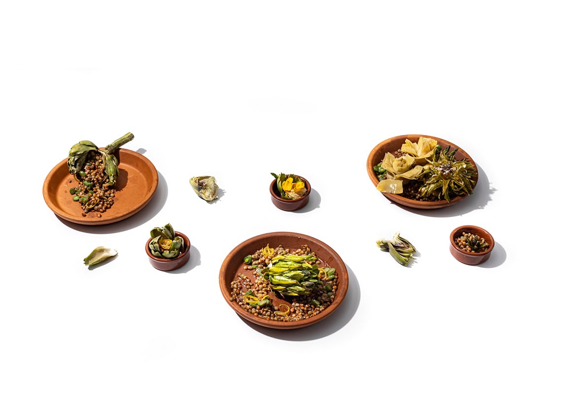 Combine all the ingredients above with the vinaigrette, finishing it off with the artichoke purée, lemon zest confit, grated parmesan and spekboom.