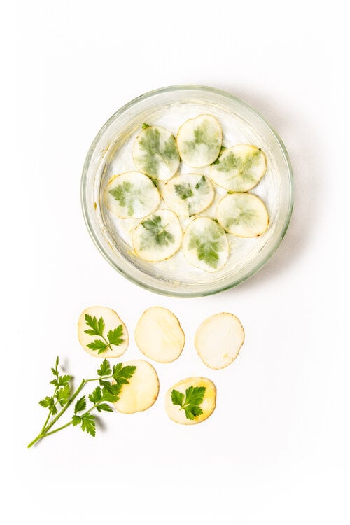 Brush each slice of potato with melted butter and place fresh parsley leaves on top. Place the potato slices – with the parsley face down – in a bowl. Brush again with butter. Place the dish in the fridge for a couple of minutes to make sure the melted butter hardens before spooning in your rice.