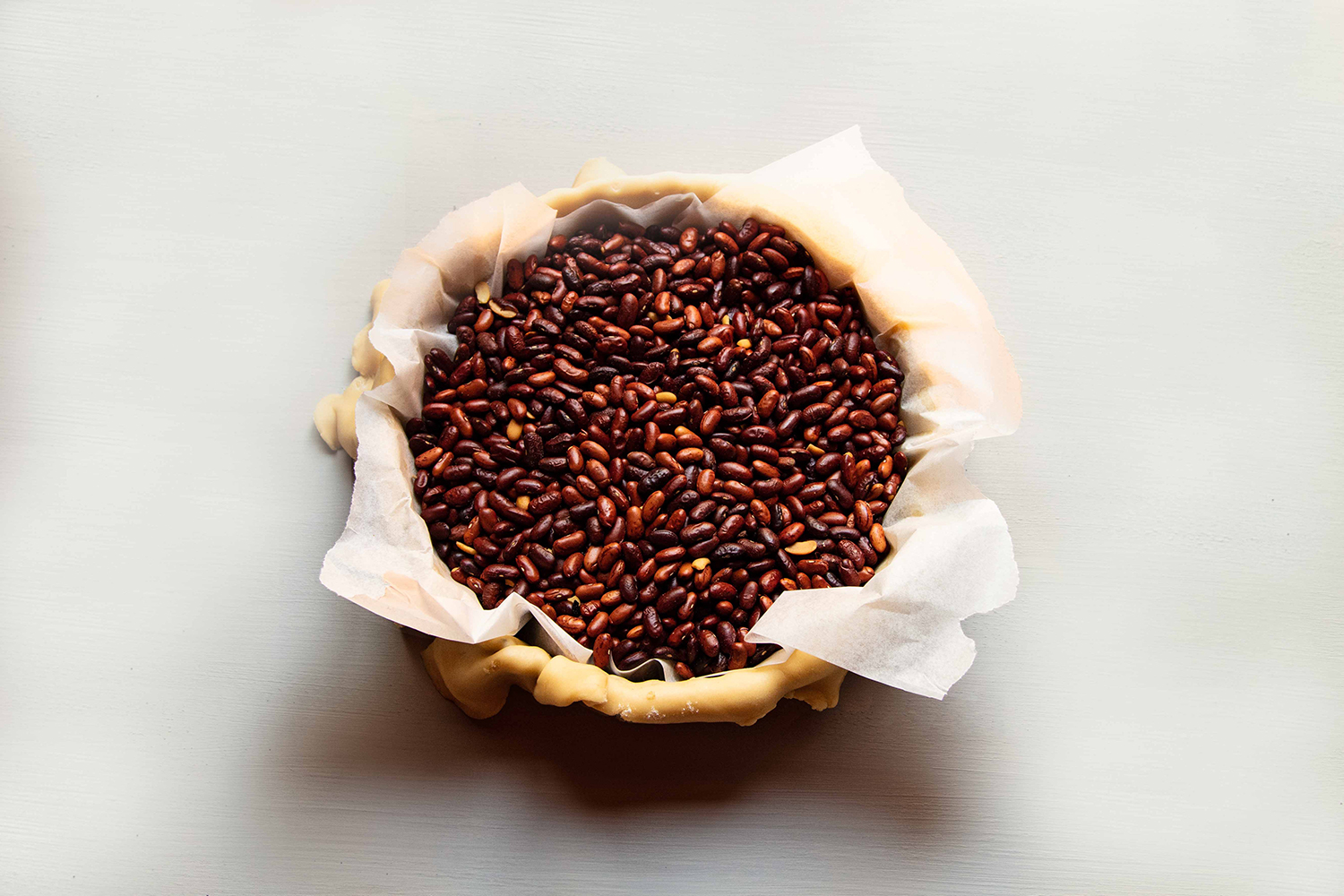 Place a big piece of baking paper over the pastry and fill it with dried beans.