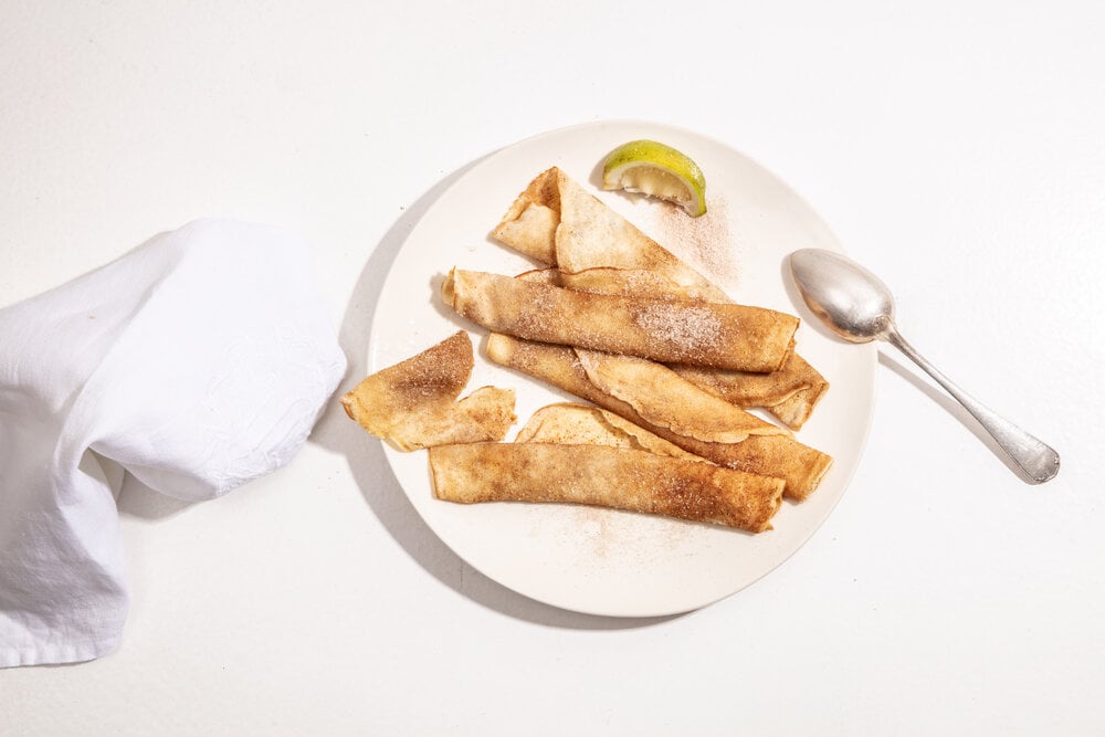 To most South Africans, bazaar pancakes need no explanation. No matter what your background – whether you’re Wilhelmina from Waterkloof or Fabrizio from Fresnay – you’ve been to a church-style bazaar, where, amidst scavenging the myriad handmade jewellery and homemade konfyt for a bargain, you can be sure some Oom and Tannie are slaving away behind a portable gas stove (or an electric one with an extension lead, if they’re being really fancy), churning out pancakes with liberal lashings of cinnamon sugar and lemon juice by the dozen. Most of us can’t imagine our childhoods without the occasional bazaar pancake, and by the same token, can’t imagine going through the rest of our lives without them. Well, I’ve concocted what, in my mind at least, is the perfect bazaar pancake, so never say I wasn’t thinking about you.