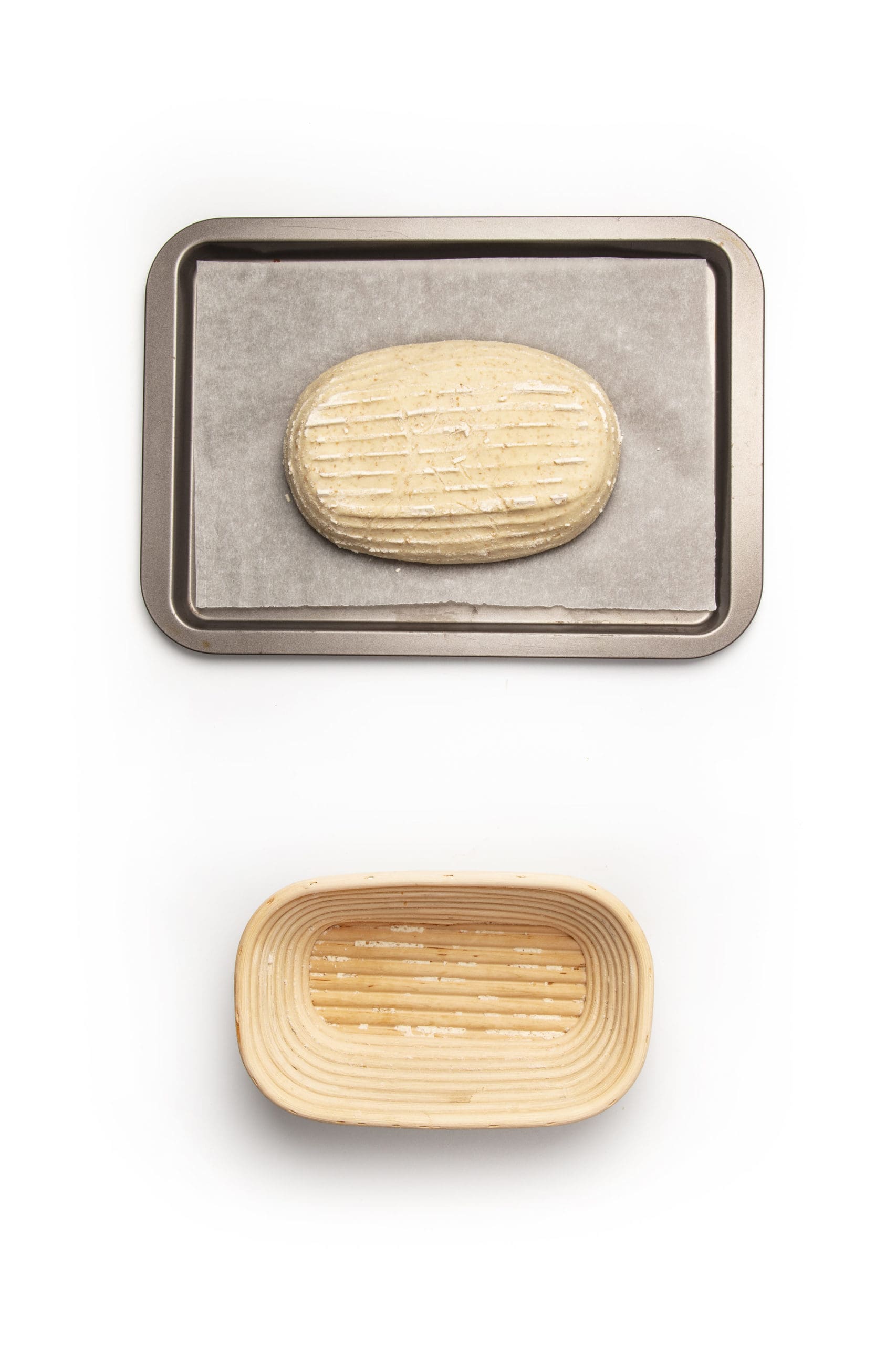 Take the dough out of the bowl and place on a floured work surface. Knead the dough for 2 minutes. Sprinkle some flour into your bread baskets (bannetons) and shape the dough into a long shape.