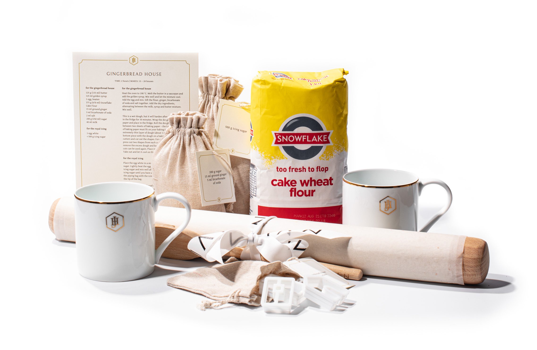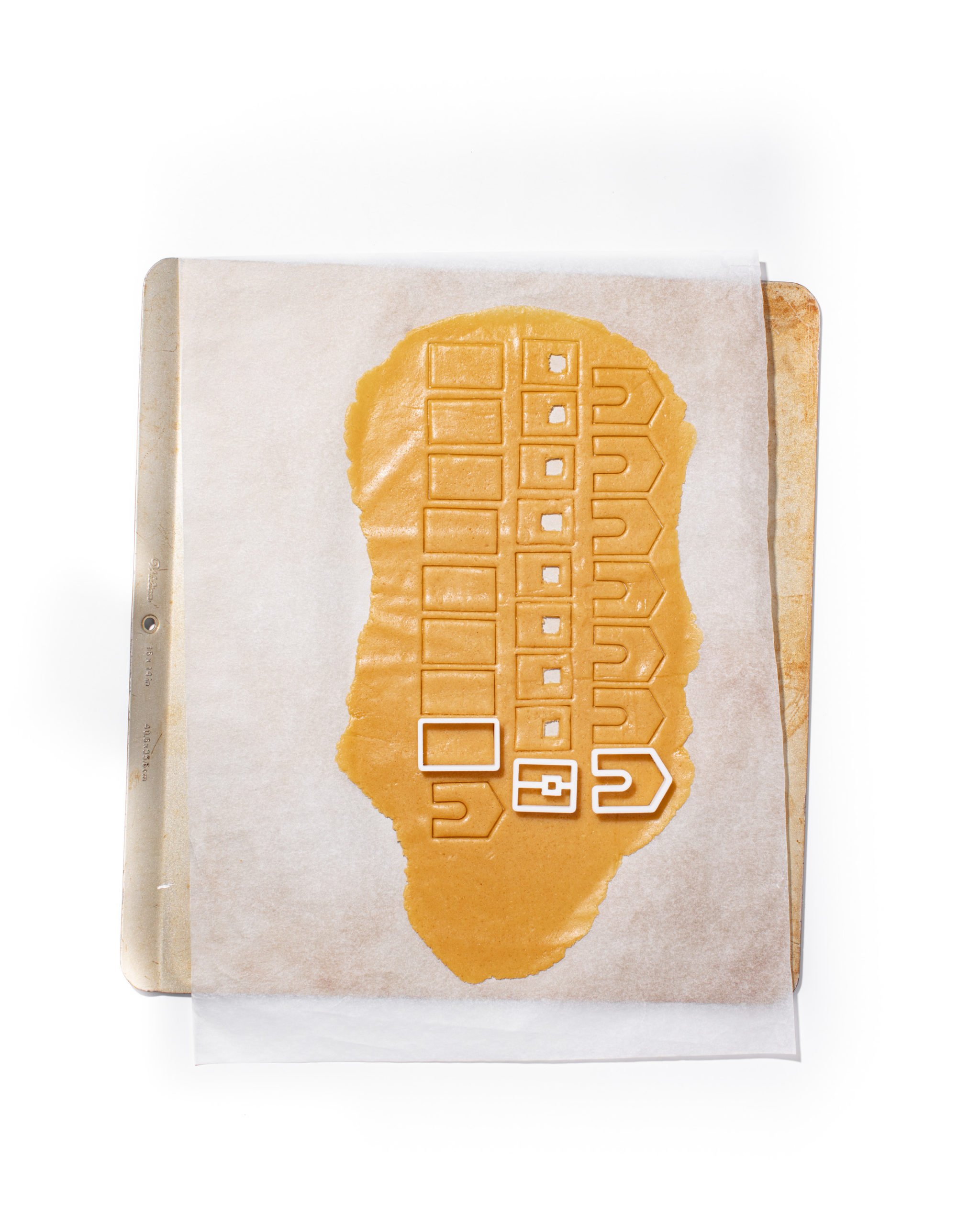 Wrap the dough in baking paper and place in the fridge. Roll the dough (in batches) between two sheets of baking paper – the bottom piece of baking paper must fit on your baking tray. Roll into an extremely thin layer of dough (about 1 mm). Place the bottom piece with the dough on a baking tray. Use the cutters and cut out the shapes. For one house you need press out two shapes from each cookie cutter.