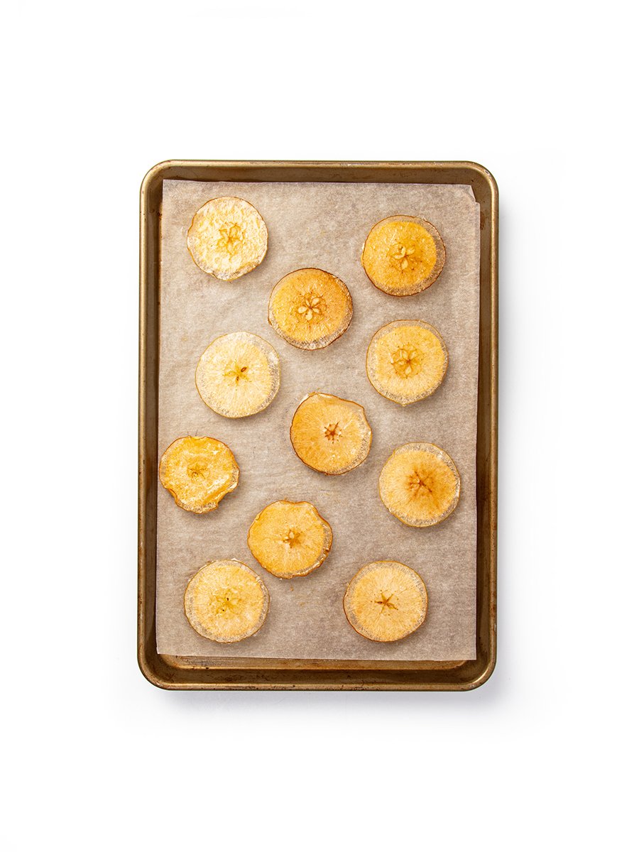 Heat the oven to 180 °C. Slice the apples very thinly with a mandolin slicer or use a very sharp knife. Keep the sliced apples in lemon water to prevent them from browning.