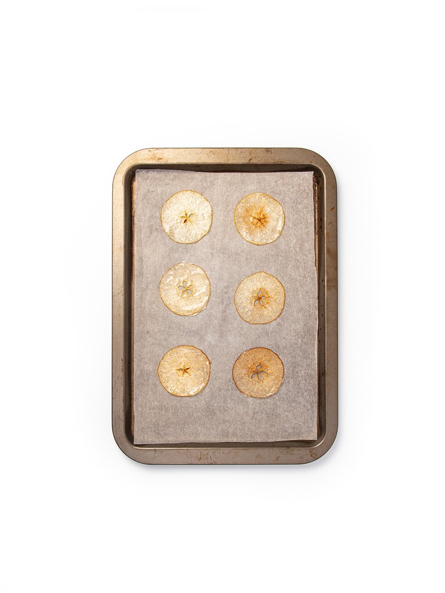 Arrange the apples on baking trays lined with baking paper. Spoon about a teaspoonful of the second syrup on top of each apple slice and spread it out thinly. Place another sheet of baking paper on top and place in the oven for 12 – 15 minutes. Take it out and immediately remove the paper on top. Immediately also remove the apple slices from the baking paper and place on clean baking paper. Keep to one side.