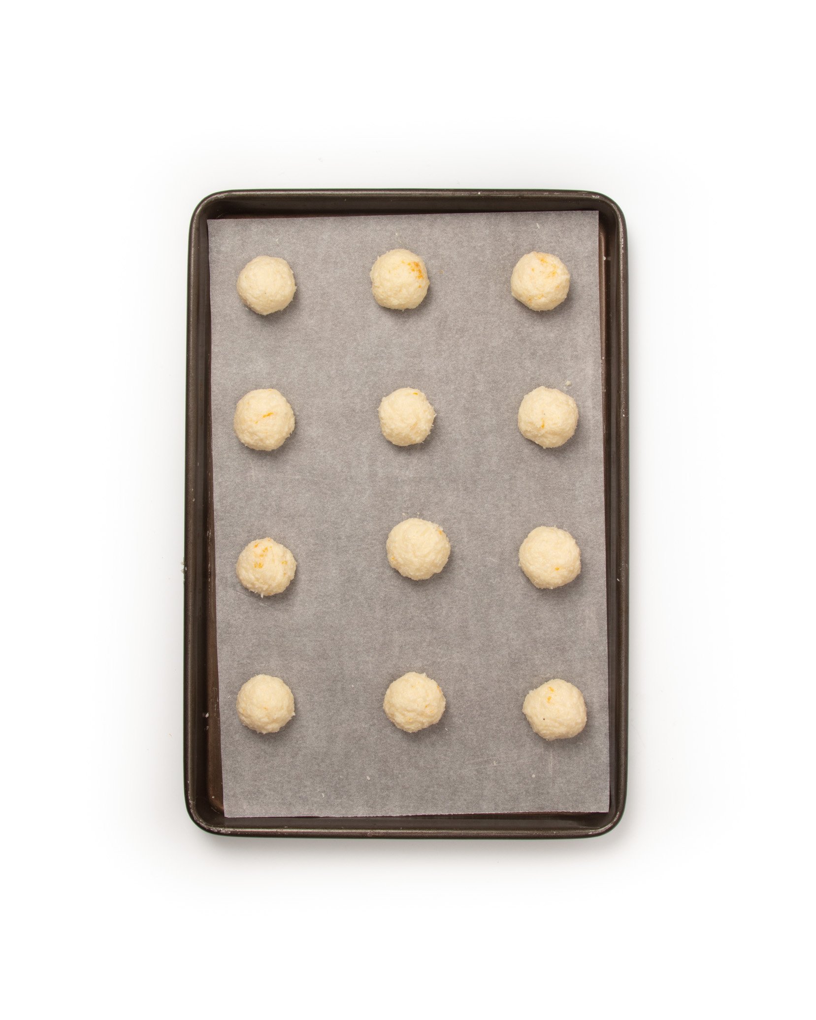 Beat the egg whites to medium stiff peaks. Fold into the coconut mixture and add the naartjie zest, then place the mixture in the fridge for 20 minutes.