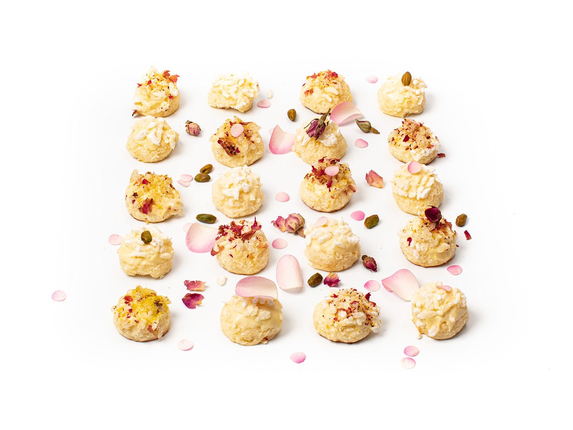 Apart from an extra “o”, the main difference between a macaroon and a macaron is in the main ingredient. Where macarons (French) are made with almond flour, macaroons (American) are made with desiccated coconut. But being a touch more rustic, macaroons allow you to play a bit more in the kitchen. For these macaroons, for instance, I had some fun with Middle Eastern and Asian flavours. Apart from making them more substantial, the Jasmine rice also lend these sweet treats a lovely flavour, while the rose and pistachio toppings add a welcome Persian flair to your high tea.