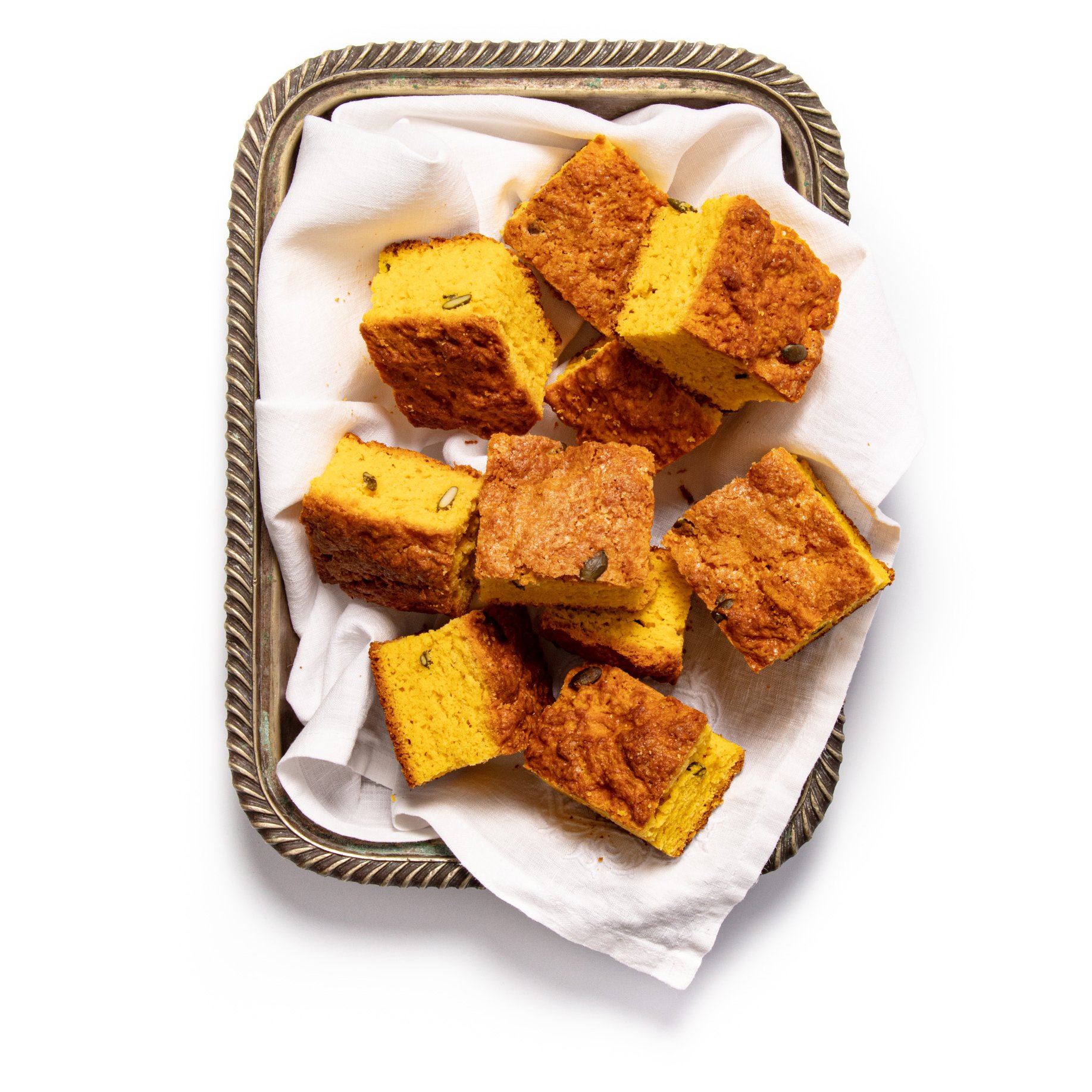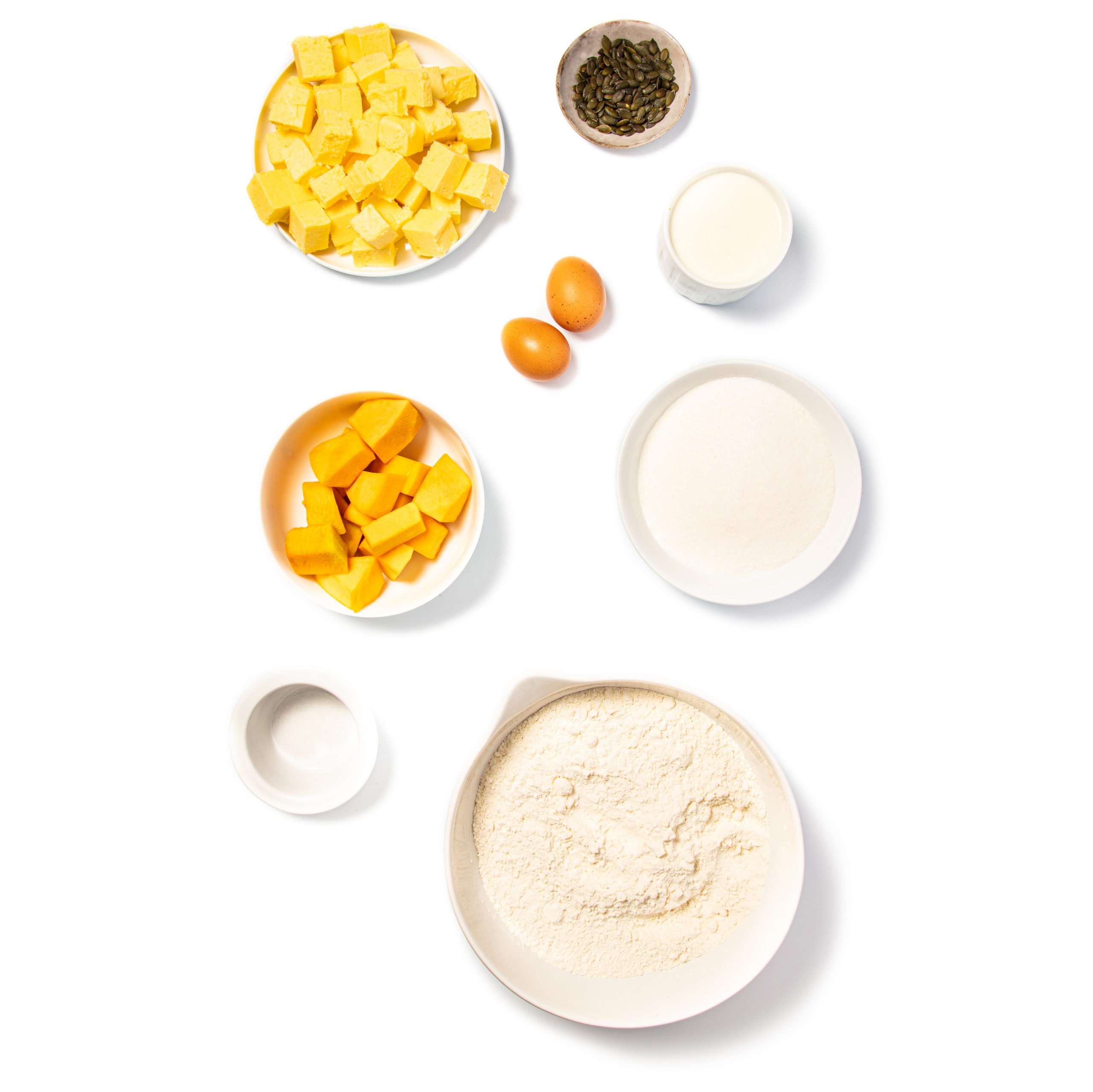 Place the flour and salt in a large mixing bowl. Add the butter and rub into the flour with your fingertips until it resembles fine breadcrumbs. Then, add the sugar and mix. Beat the buttermilk, pumpkin purée, and eggs together, add this mixture to the flour mixture and mix. Spoon into your prepared tins. Sprinkle pumpkin seeds on top.