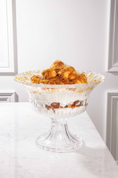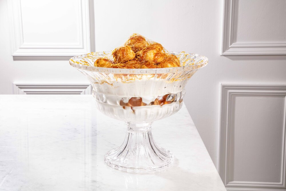 Fill the choux puffs with the custard. Whisk the cream until stiff. Melt the 200 g sugar over a low heat (do not stir) until it’s a golden caramel. Let it cool for 1 minute. Spoon a little caramel on top of each puff. Spoon a layer of cream into a large serving bowl. Drizzle some syrup over the cream, then pack a layer of filled puffs on top.