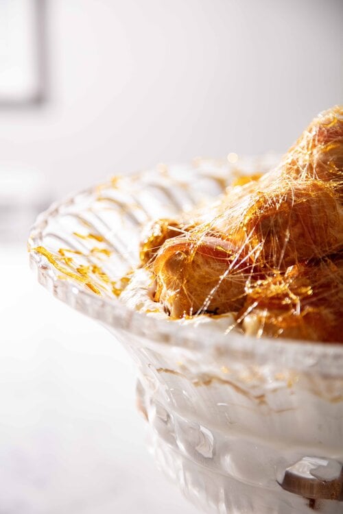 Repeat this once more. Melt the second batch of sugar over a low heat – do not stir – until golden caramel. Let it cool for 1 minute. Use a spoon and drizzle the caramel over the last layer of puffs.
