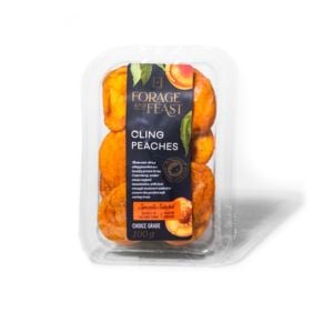 Melted dark chocolate, Forage And Feast Soft Eating Cling Peaches (chopped), toasted nuts, edible dried flowers.