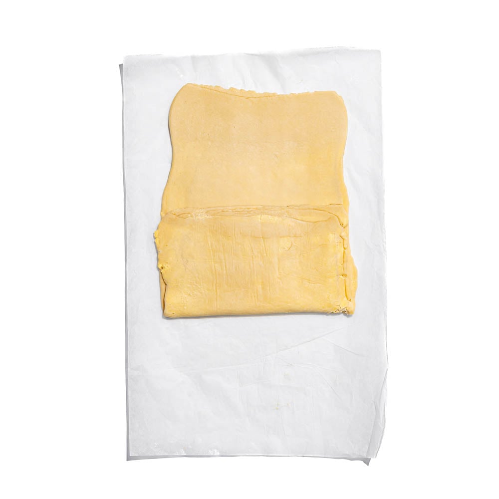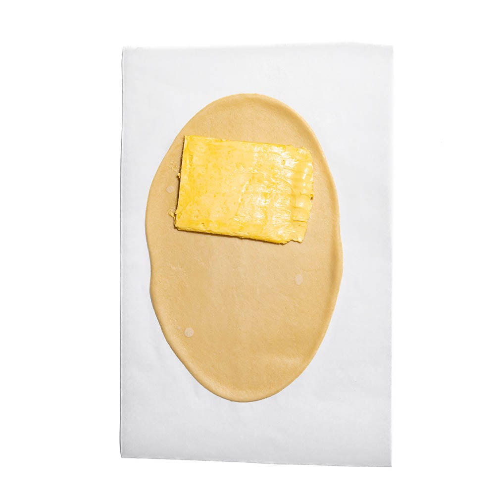 Place the dough on the surface and flatten using a rolling pin, roughly into the shape of a rectangle. Place the dough disk on a baking sheet and refrigerate for 30 minutes. Again with a rolling pin, flatten the butter into a square disk (roughly 13 cm x 13 cm) and place on the left side of the rolled-out dough. Fold the dough over the butter and ensure the butter is completely enfolded. Fold in the edges and seal them well.