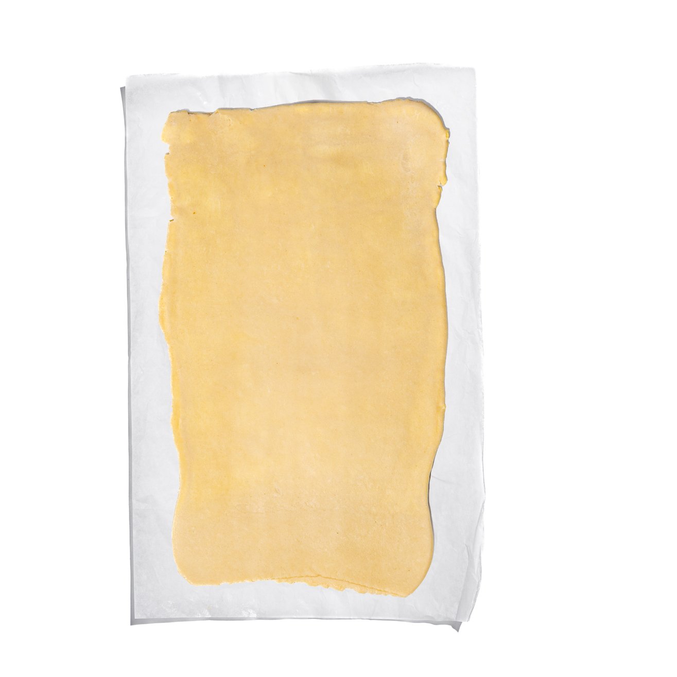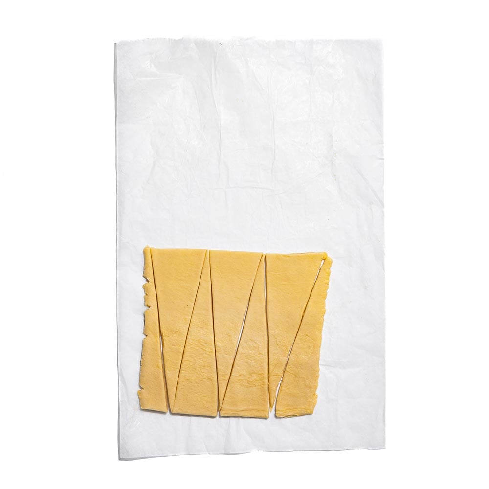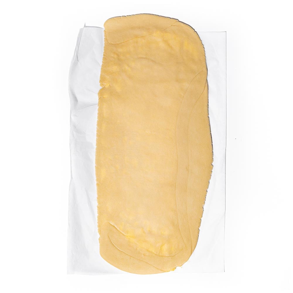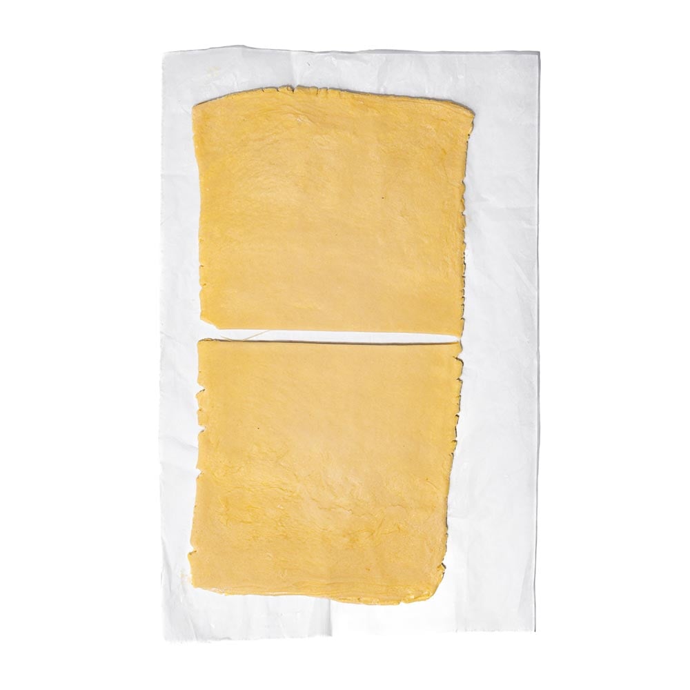 Place the chilled dough on a floured surface and roll out into a rectangle (25 cm x 50 cm), then cut the dough in half.
