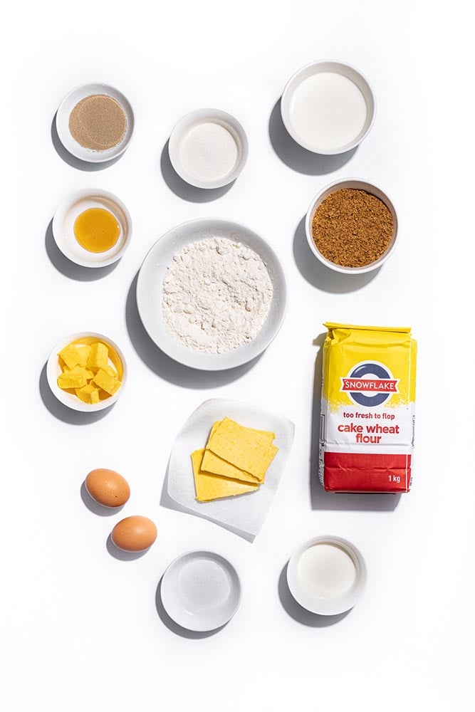 Combine the milk and dried yeast in the bowl of a stand mixer. Add the remaining ingredients, except for the 125g butter and biltong powder. Fit the stand mixer with a dough hook and knead the dough at a low speed for 4 minutes, then at a medium speed for another 6 minutes. The dough should be soft and elastic. Shape the dough into a ball, place in a bowl and cover, allowing it to rise for 30 minutes.