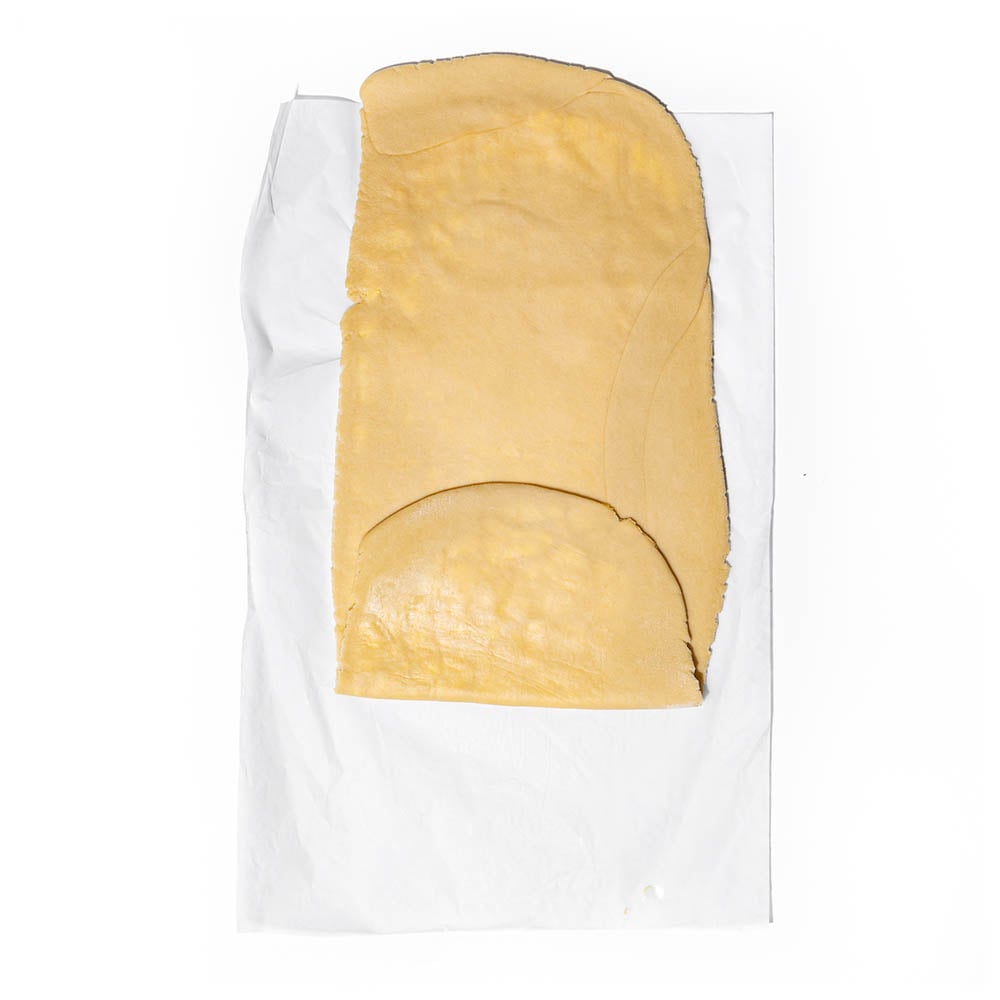 Place the chilled dough on a floured surface and roll out into a rectangle (25 cm x 50 cm), then cut the dough in half.