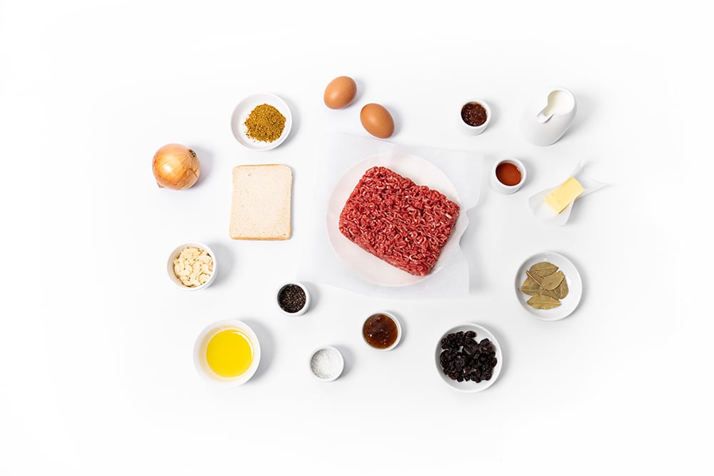 Combine the caramelized onions, soaked bread, minced meat, eggs, and all the spices in a mixing bowl. Integrate chutney, apricot jam, and raisins into the mince mixture. Transfer the prepared mixture into a baking dish and bake for 1 hour in the bain marie in the preheated oven.