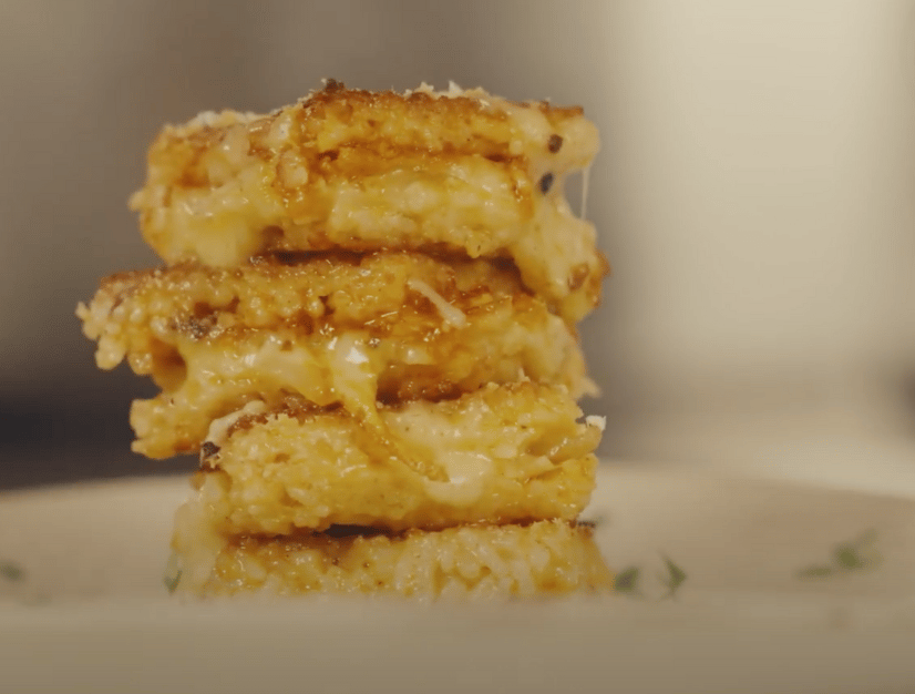 Cook the Spekko basmati rice according to the packet instructions, drain any excess water and place the rice in a bowl, mix in the egg and the tomato chutney and fine salt. Prepare a baking tray or flat tray with baking paper and press the rice down firmly while still luke warm in about a 1 cm thick layer. Place in the freezer for 1 hour until completely cooled down. Slice the rice into 4 equal squares, spread the tomato pesto on two of the slices. Layer the other two slices with sliced cheese and pickled onions. Place the two sliced on top of one another, and cut into 4 equal small squares. In a large pan, start melting the butter and toast the slices until golden brown in colour.