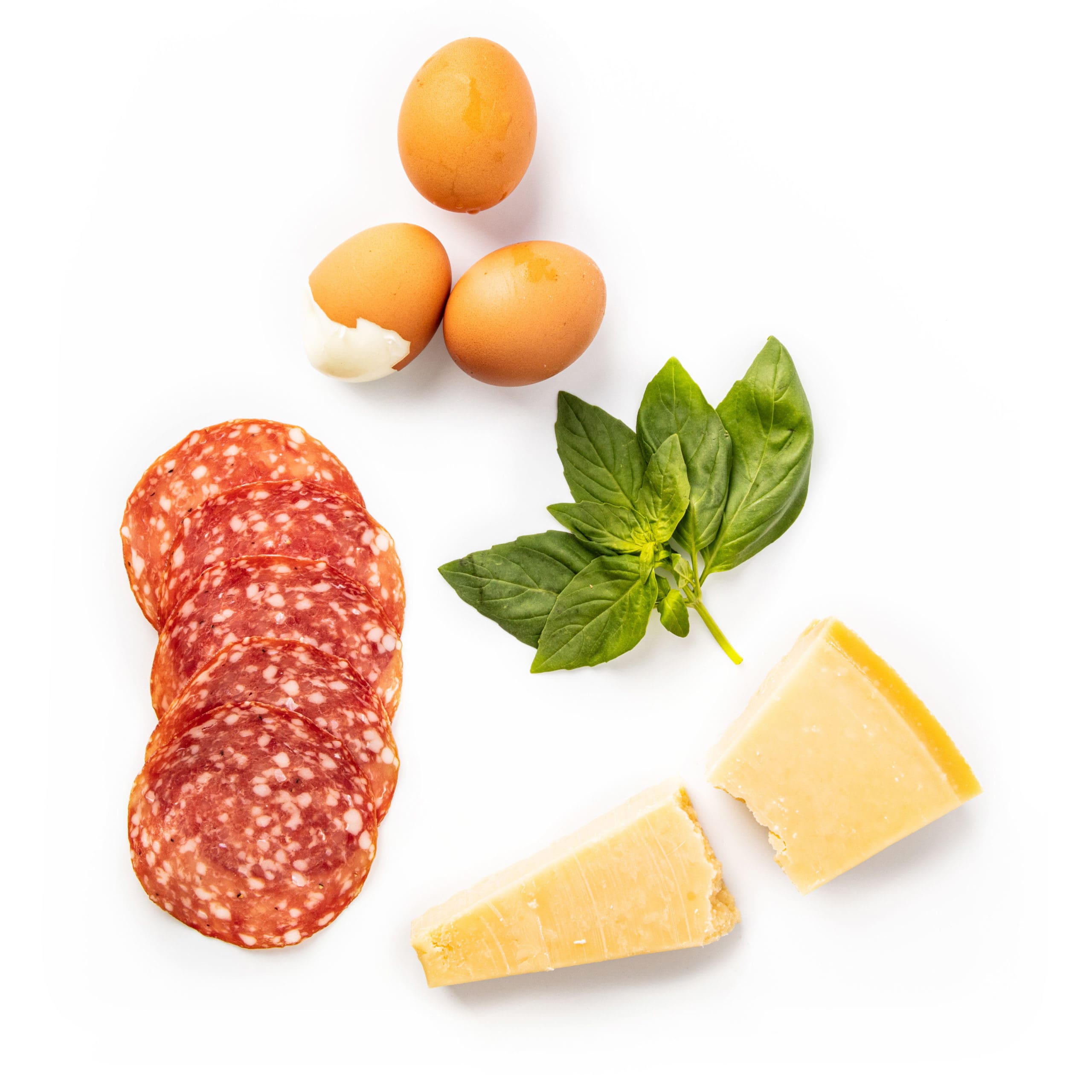 Spoon more penne on top, followed by the rest of the basil, salami, chopped egg, parmesan cheese and penne. Pour the beaten eggs over. Fold the pasta over the top and brush with some water to make the pasta stick together.