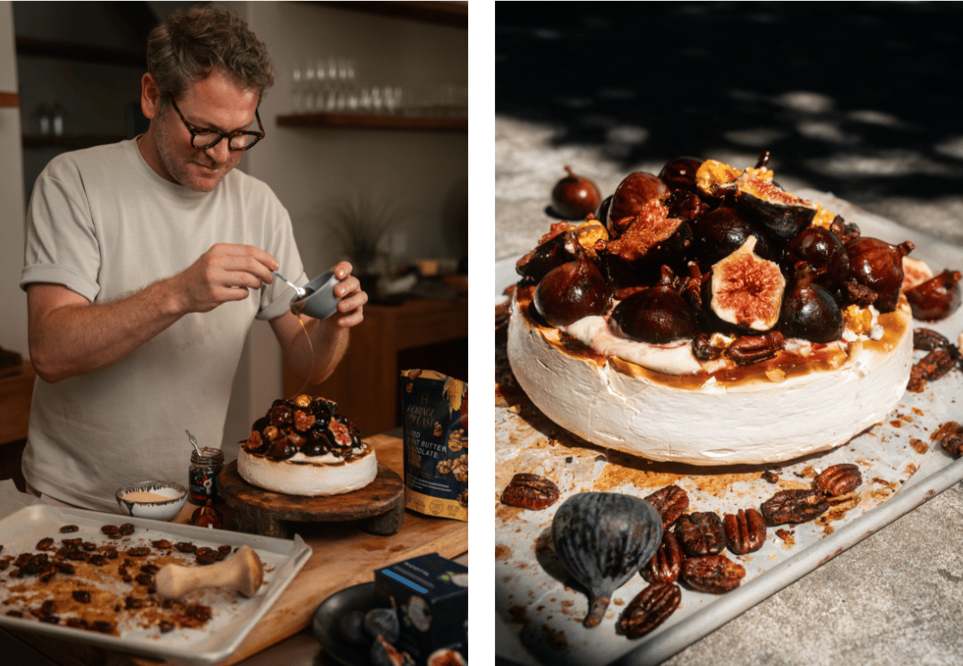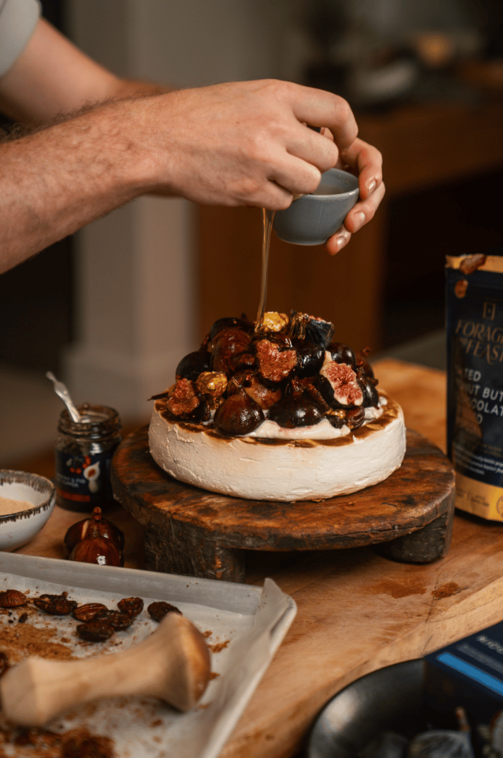 Gently scoop the mixture into the braaied pavlova. Now, place the figs, nuts, and the Forage And Feast Salted Peanut Butter & Chocolate Drizzled Popcorn on top. Don’t be shy, stack them as a tower. If you have any fresh figs left, cut them open and place them as additional garnish. And there you have it, a braaied pavlova cake, a special dessert to honor all the mother figures in your life.