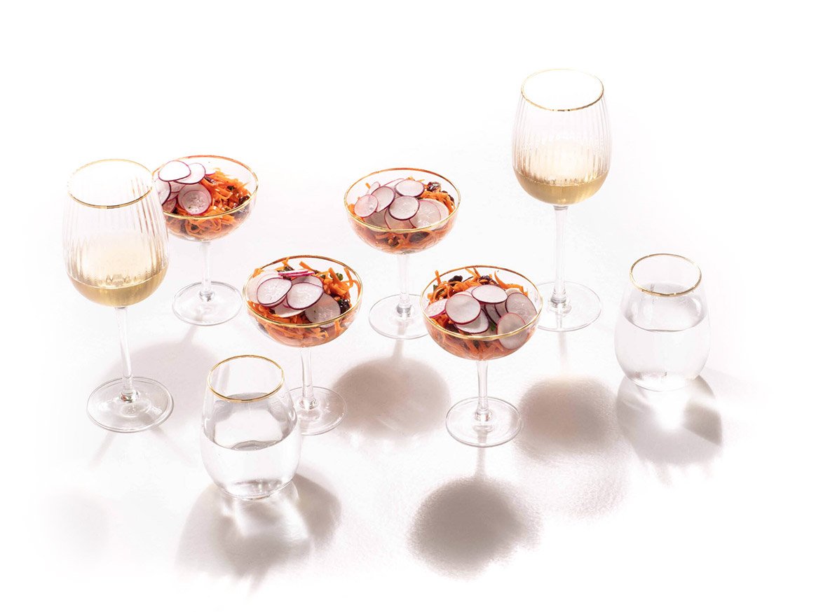 Spoon the salad into festive glasses and top with thin slices of radish.