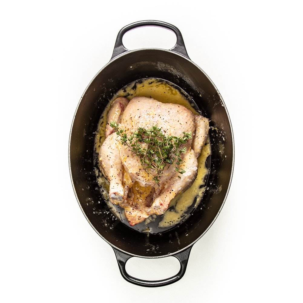 Place the chicken in the saucepan. Brush the melted butter all around the chicken and season with salt and pepper.