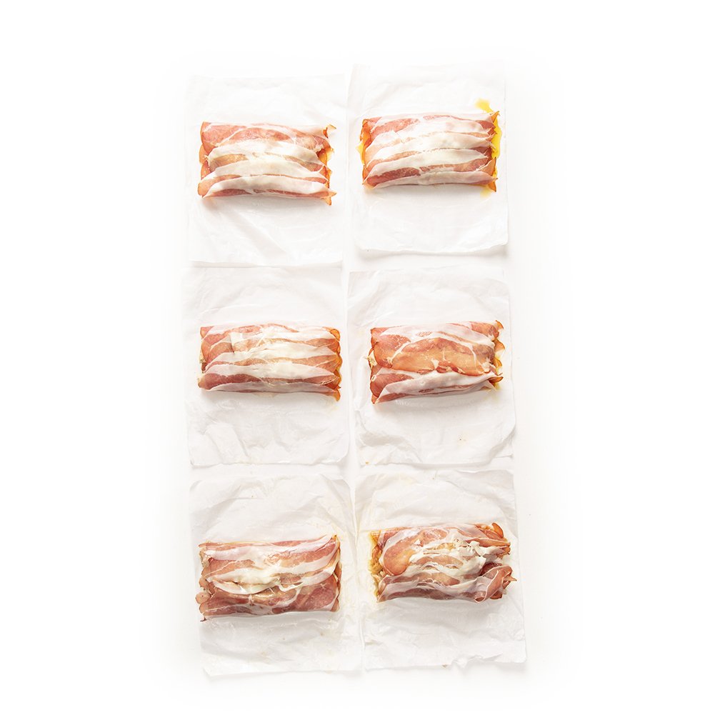Lay the black forest ham overlapping on your work surface and place the chicken meat on top.