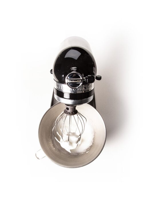 Beat the egg whites to soft peaks. With the mixer running, carefully and slowly drizzle in the hot syrup. Increase the speed to high and whip until the desired stiffness is achieved. Whip until the meringue has cooled.