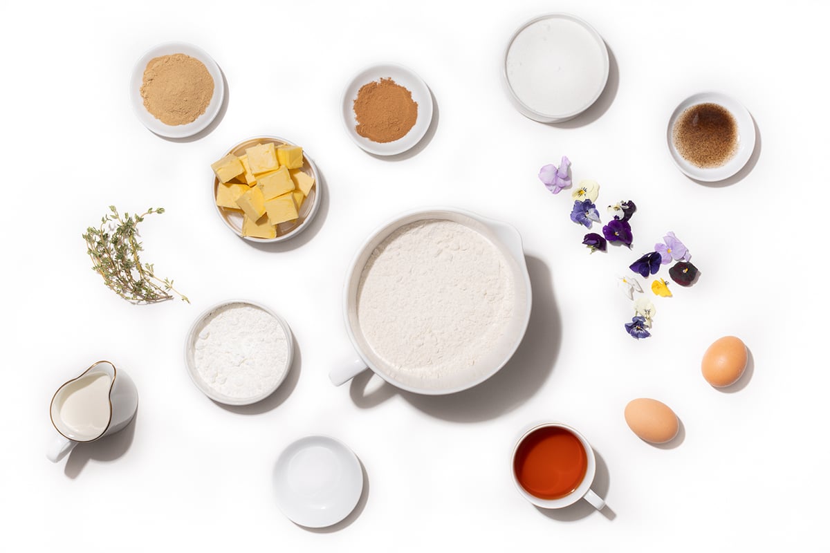 Preheat the oven to 160 °C. Roll the dough out about 5mm thick, and cut into circles using a round cutter about 5 cm big. Sprinkle half of the cookies with cinnamon sugar, and the remaining place edible flowers on top. Place the disks on a prepared baking sheet and bake for 12 – 15 minutes until golden brown.