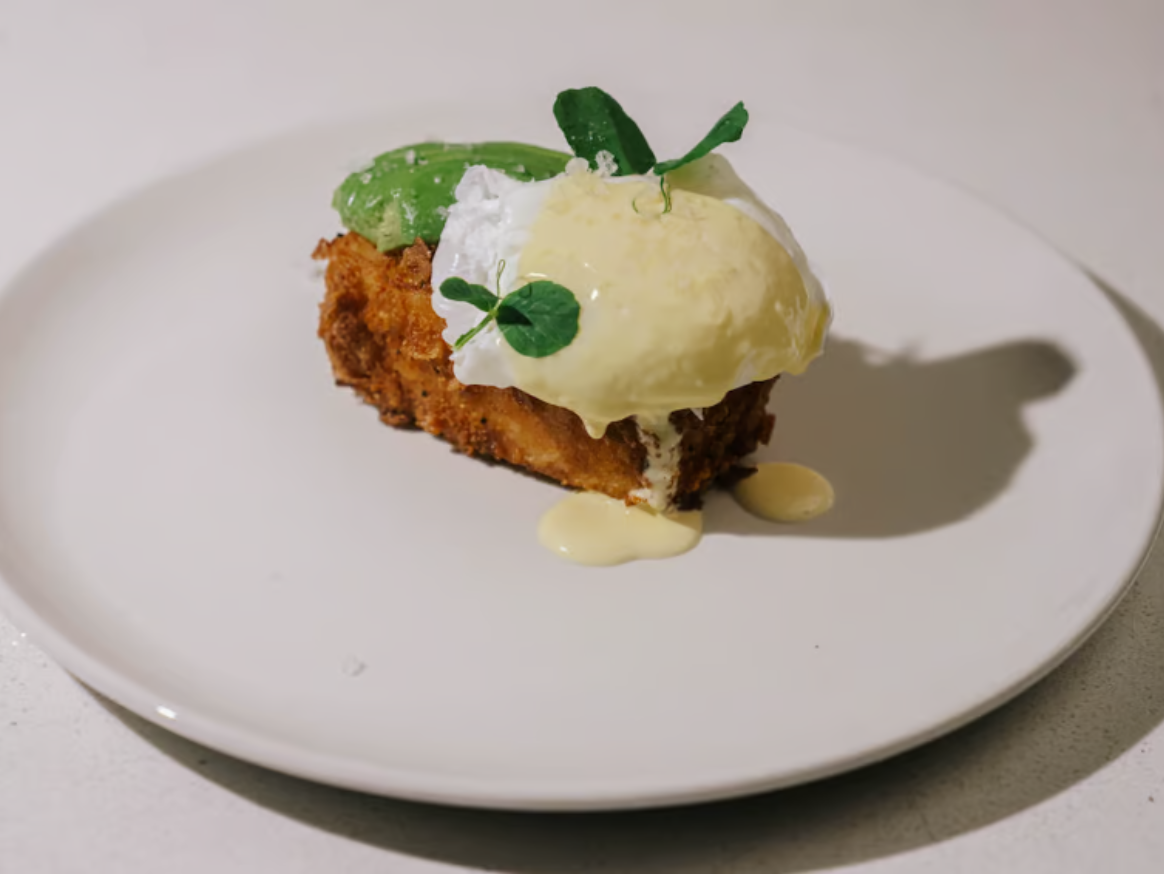 Place the Kellogg’s Corn Flakes crusted pave on a plate, top with a beautifully poached egg, sliced avocado, flaky sea salt and finish with your Hollandaise sauce