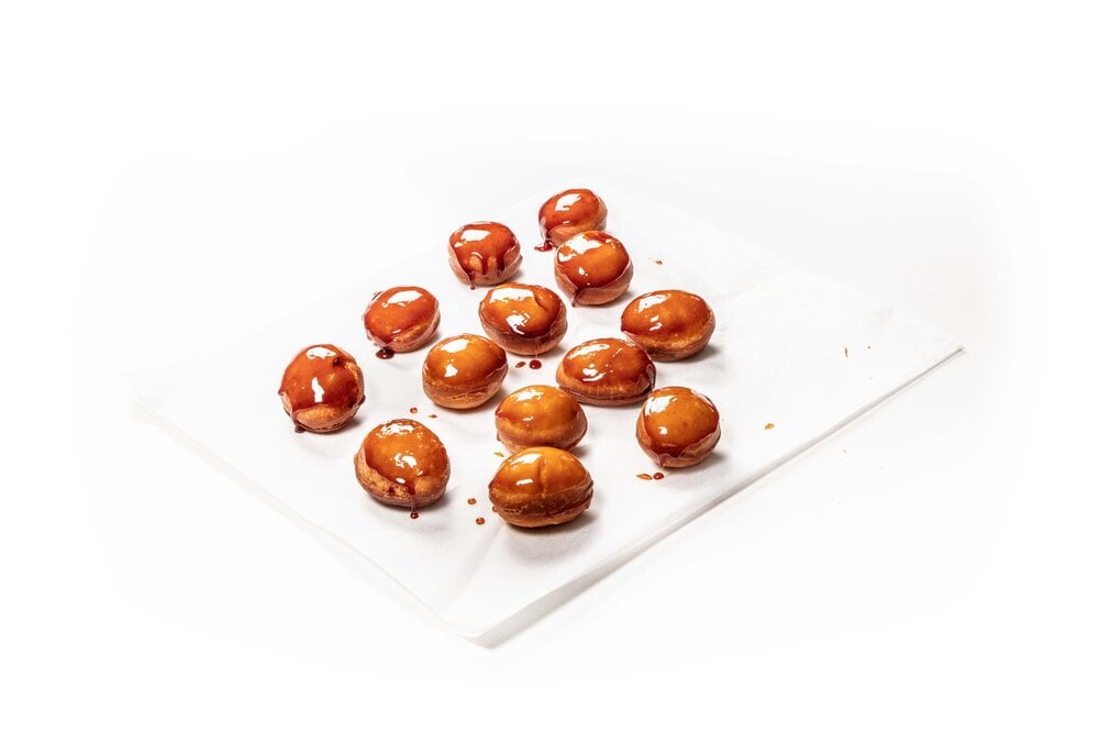 Carefully dip the doughnuts in the hot caramel.