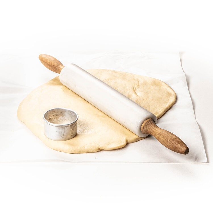 Place a big sheet of baking paper on your work surface, then roll the dough out onto the baking paper. Using a 4 cm cookie cutter, press circles in the dough. You should get at least 15 doughnuts.
