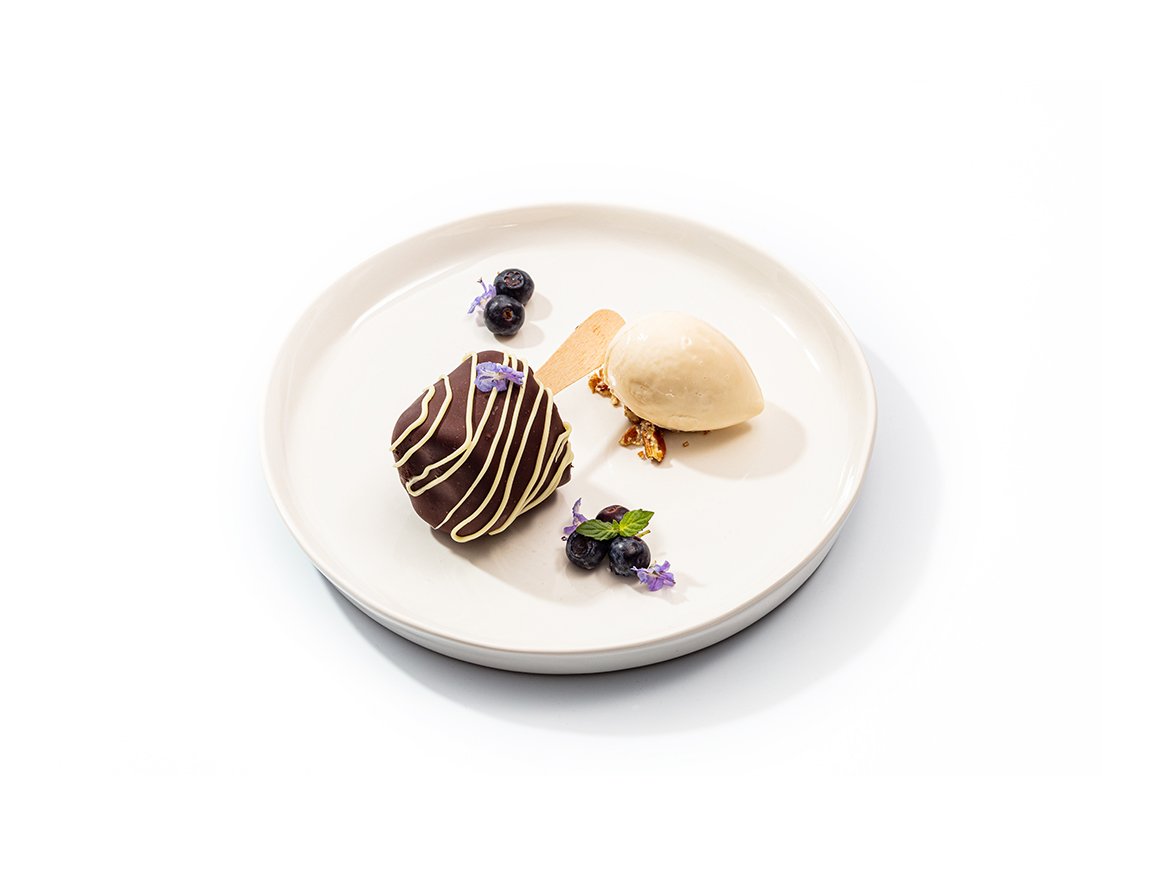 Remove the puddings from the freezer and press a lollipop stick into each pudding. Dip each lolly into the melted chocolate and place on a baking tray lined with baking paper. As an optional garnish, drizzle each lolly with melted white chocolate. Serve with fresh blueberries and good quality shop-bought vanilla ice cream.