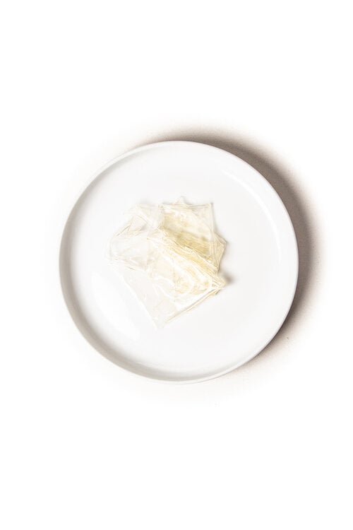 Remove the gelatin leaves from the water and squeeze out any excess water. Add the gelatin to the hot syrup and let it dissolve.