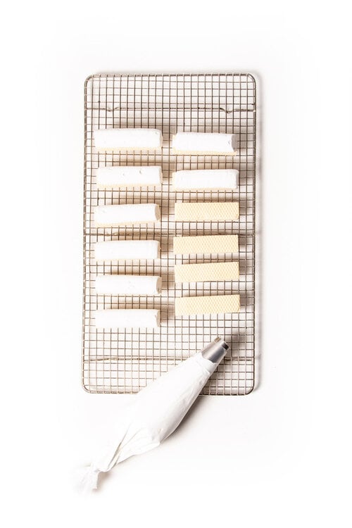 Arrange the wafer biscuits on a cooling tray. Fill a piping bag fitted with a 3.5 cm plain nozzle with the meringue. Pipe the meringue on top of each biscuit. Keep a small, sharp knife and warm water aside to cut the meringue and the end of each biscuit. Keep to one side while you melt your chocolate.