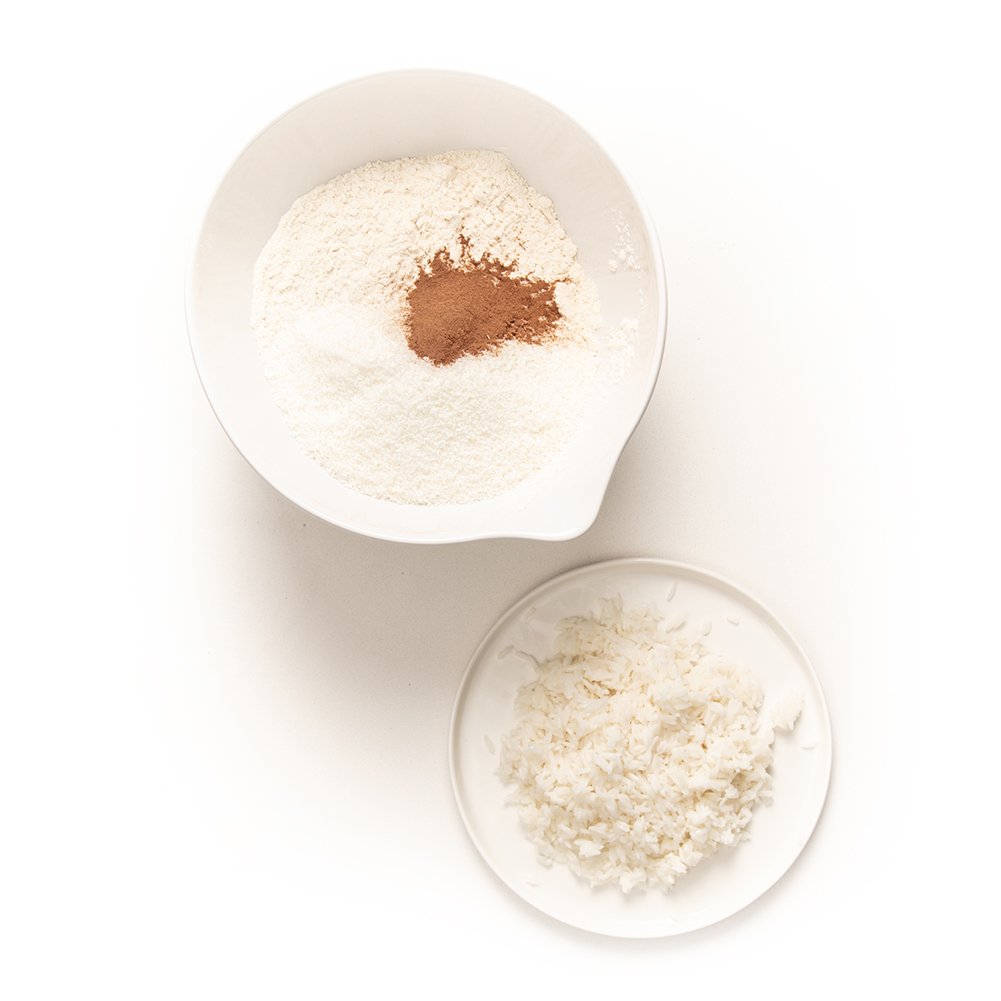 Mix the flour, cinnamon and coconut in a mixing bowl of an electric mixer fitted with dough hook.
