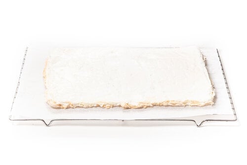 Preheat the oven to 160 °C. Line a 25 x 35 x 2 cm baking tray with baking paper and spray with a non-stick edible food spray. (One doesn’t normally spray good quality baking paper, but this meringue is quite sticky. By spraying the baking paper you will make sure the meringue won’t stick to the paper.)