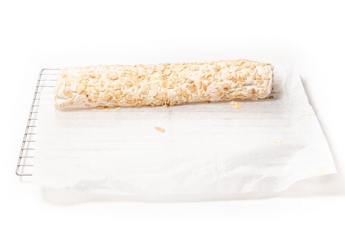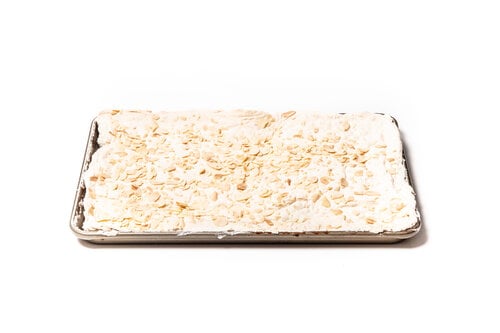Spoon the mixture onto the lined baking tray and smooth out the meringue. Sprinkle the almonds on top. (Not only do the almonds add great taste and crunch, but you will find that when you roll your pavlova the almonds also help prevent the meringue from sticking to the paper.)
