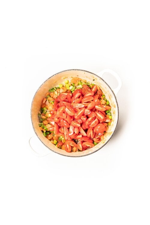 Add the tomatoes and fry for 1 minute. Add the stock and season with salt and pepper. Close with a lid and let the soup simmer for 2 hours.