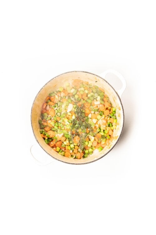 Heat the olive oil in a large saucepan and add the leeks, shallots, carrots, garlic, thyme and sliced broccoli stems. Fry over a low heat for 5 minutes.