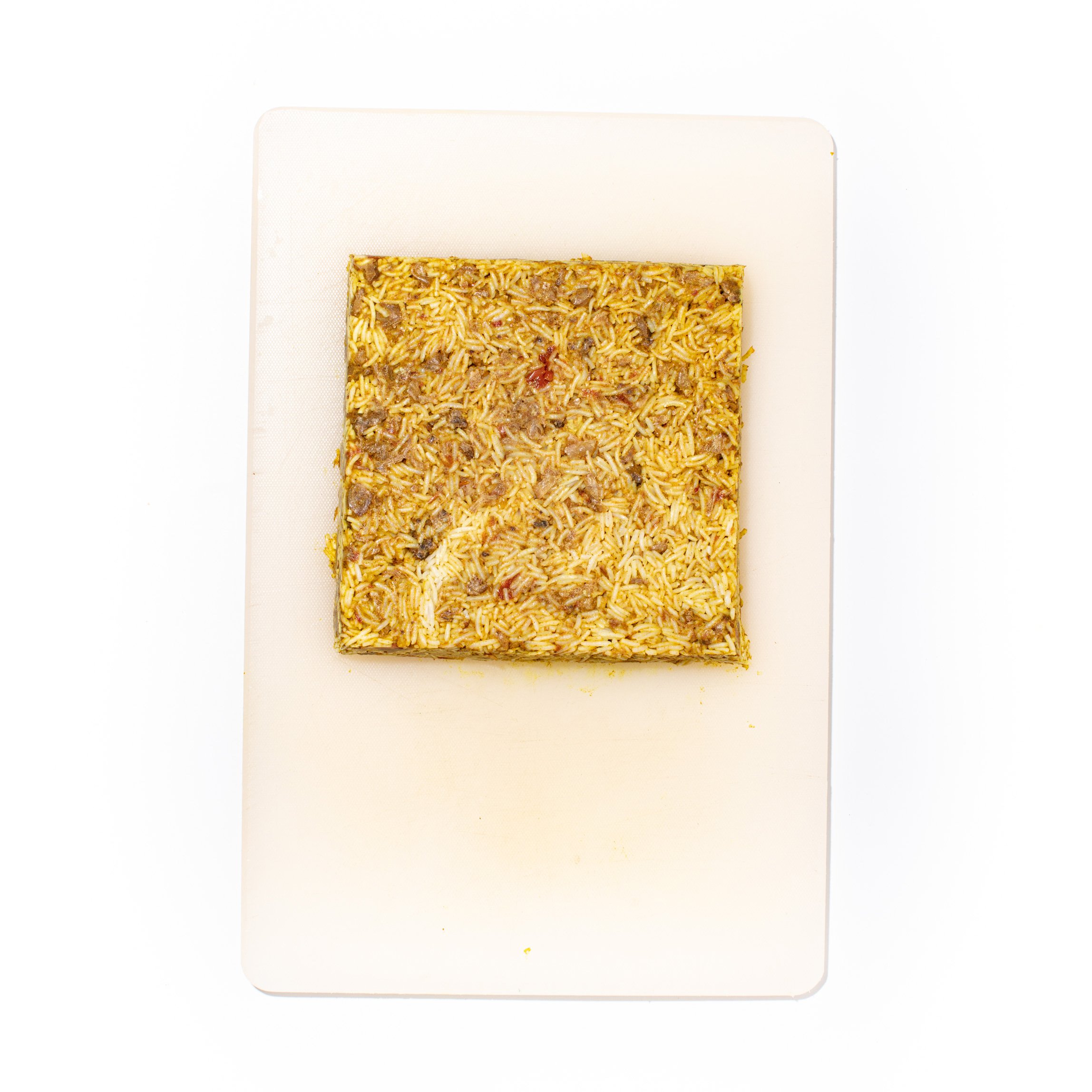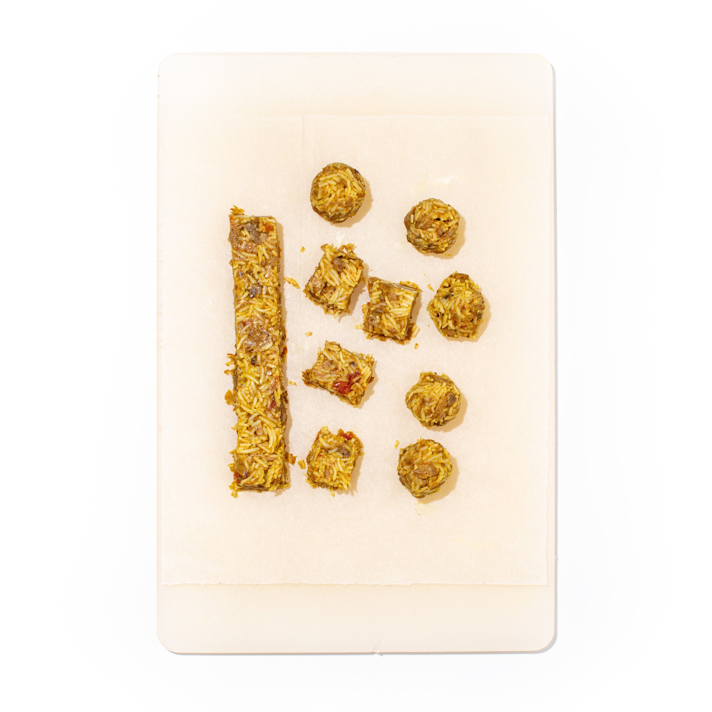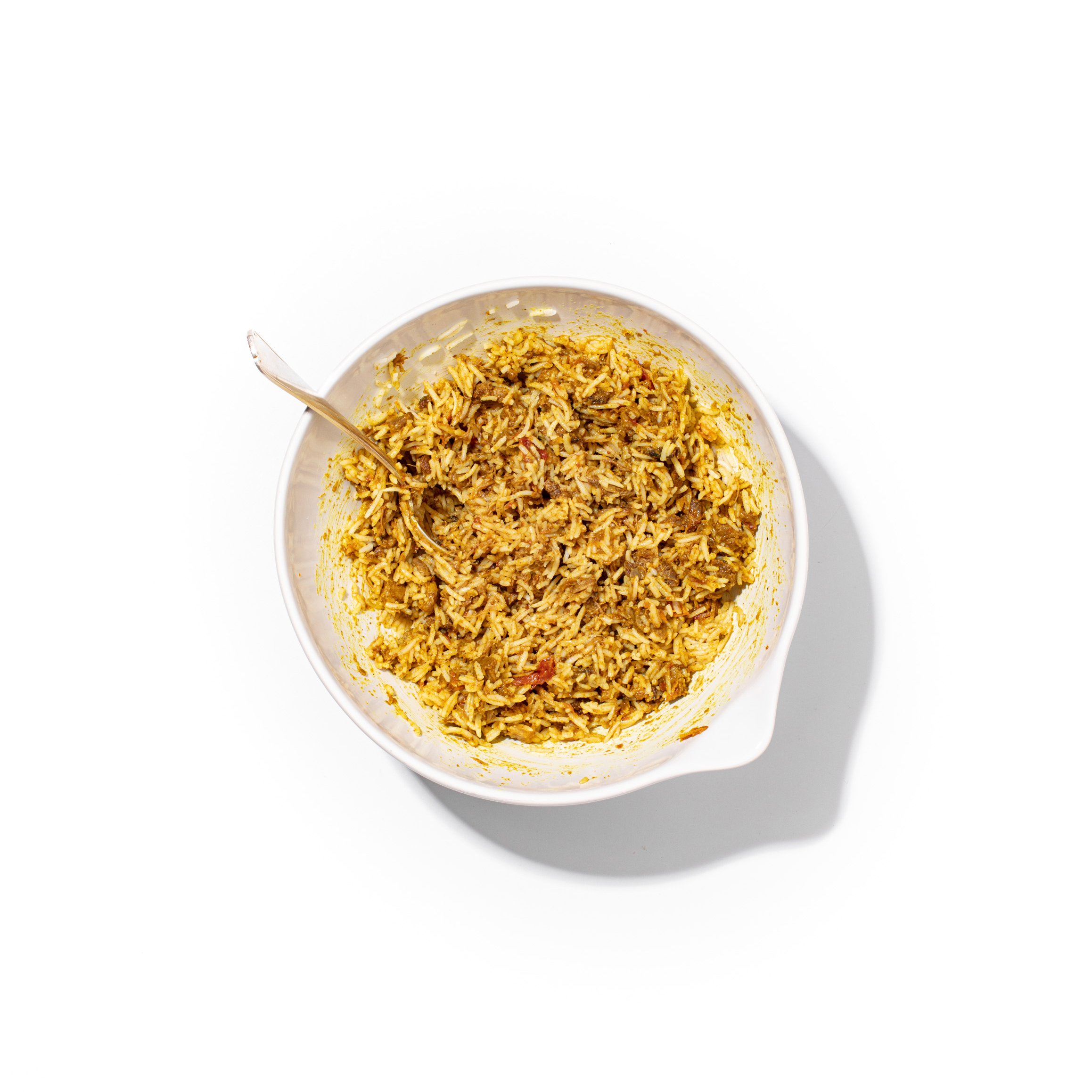 Mix the rice and meat. Press the mixture into a 20 x 20 cm pan. Place in the fridge until ice cold. Turn the rice mixture out onto your work surface. Slice into 2 cm strips. Slice into equal squares and roll each square into a ball. Dip the balls into the beaten egg and roll them in the fine breadcrumbs. Place in the fridge for 10 minutes while you heat the oil to a medium heat. Fry the balls in batches and drain on kitchen towel. Keep warm to one side.