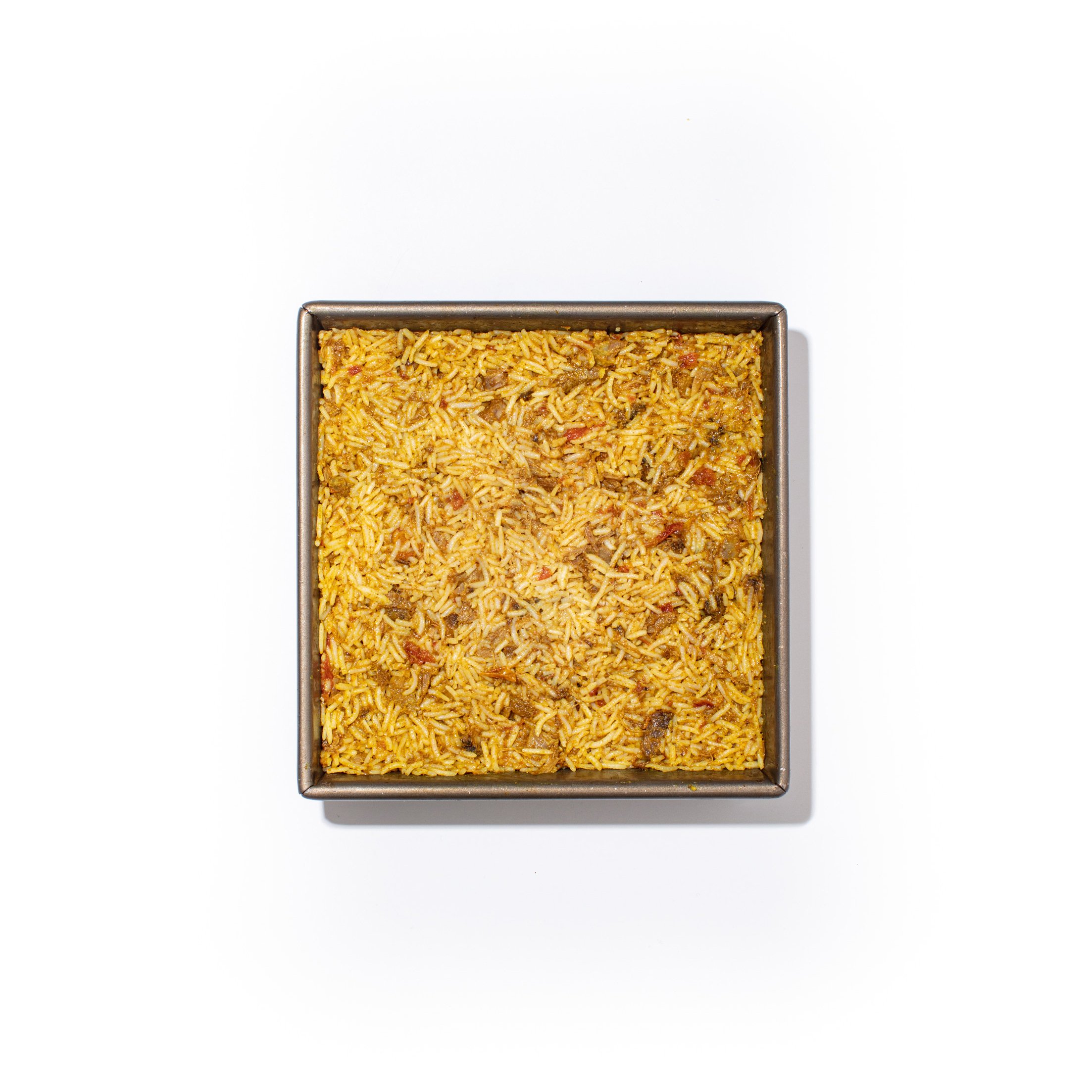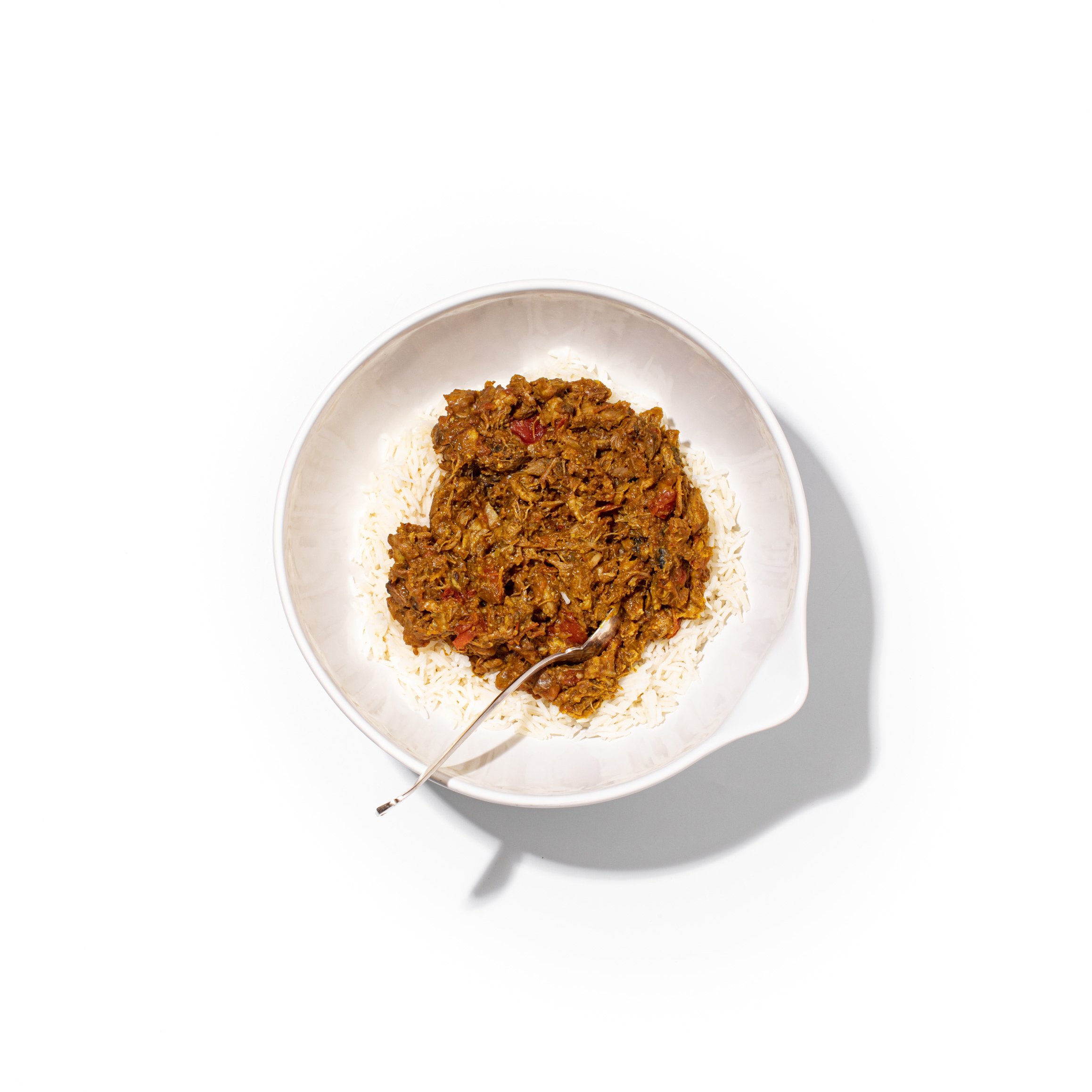 Heat the olive oil in a large cast iron pot. Brown the lamb and add the onion. Fry until the onion is soft. Add the curry powder, cumin, coriander, cinnamon and ginger, then mix well and fry for 1 minute. Add the tomatoes and season with salt and pepper. Add the water and cover with a lid. Lower the heat and let it simmer for 2 hours. Keep an eye on the liquid: if it’s cooking a bit dry, just add a little more water. Once the meat is soft, take off the heat and let it cool to room temperature. Shred the meat off the bones. Cook the rice according to the instructions on the back of the packet.
