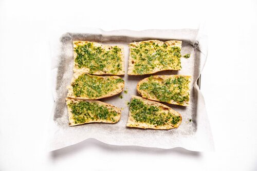 Heat the oven to 200 °C. Divide the bread into 3 pieces. Slice open each piece and place the open pieces of bread on a baking tray lined with baking paper.