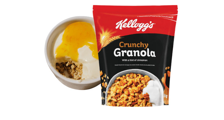 Blend 120g of the Kellogg’s Crunchy Granola into a rough texture, mix together with the whole granola pieces and the melted butter